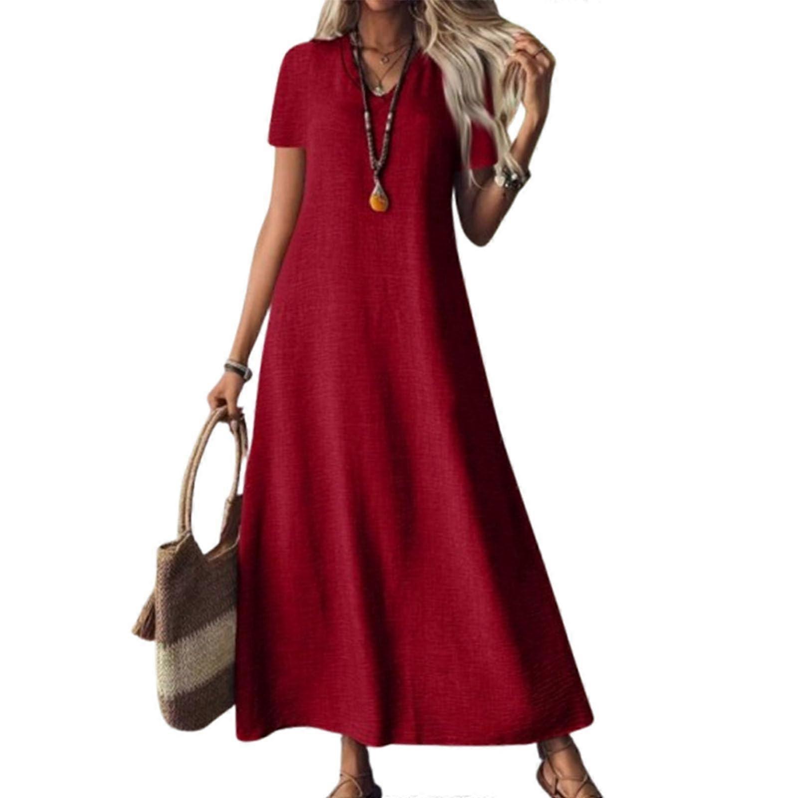 Linen Women's V-neck Short-sleeved Waist-cinching Long Dress Casual Summer Beach Vacation Dress Burgundy XL