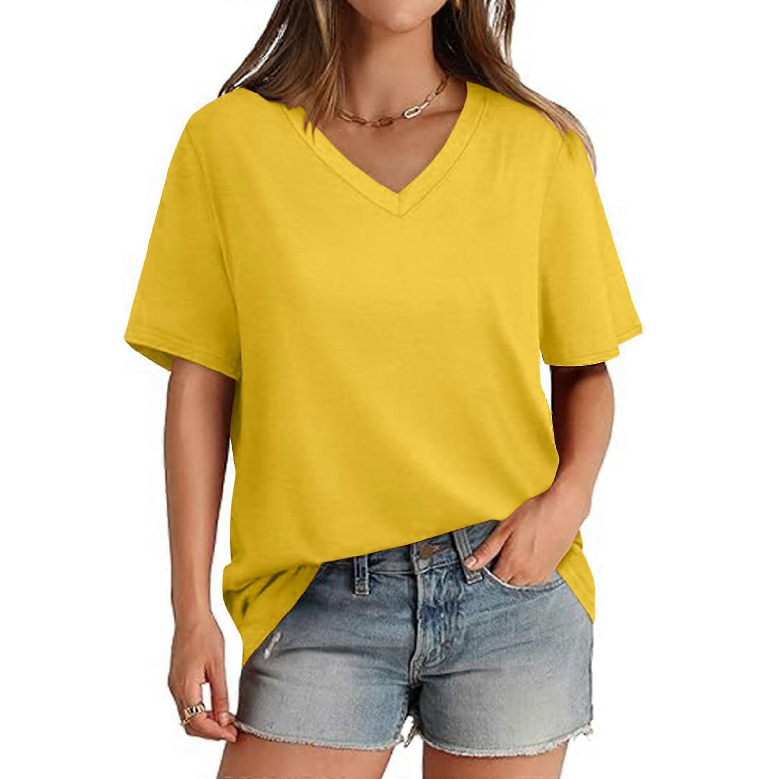 Women's V-neck short-sleeved solid color loose basic top, comfortable casual formal wear Yellow XL