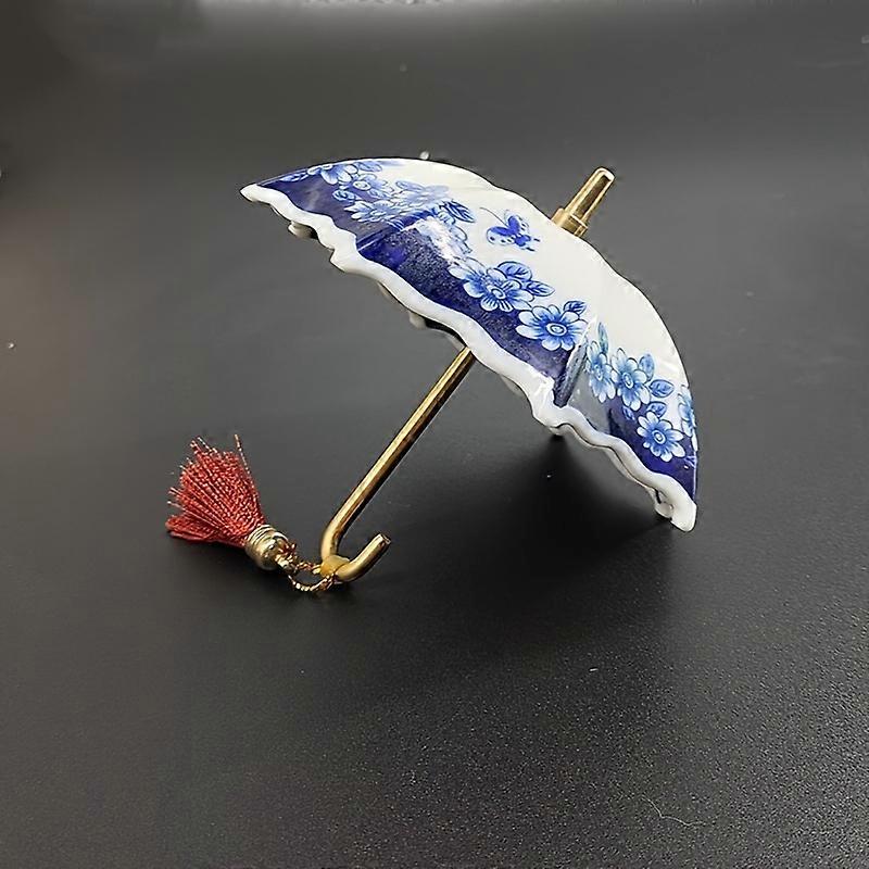 1pc Ceramic Tea Strainer - Blue & White Umbrella Design with Tassel, Compact for Office/Home Decor,for Kung Fu Tea Sets