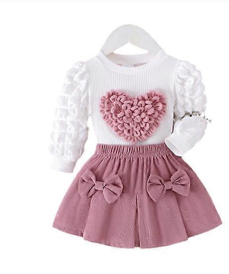 Girls Clothing Set Puff Sleeve Ribbed Patchwork Hearted Pattern Tops + Bowknot Pleated Skirt Two Piece Sets for 0-3Y Baby Outfit