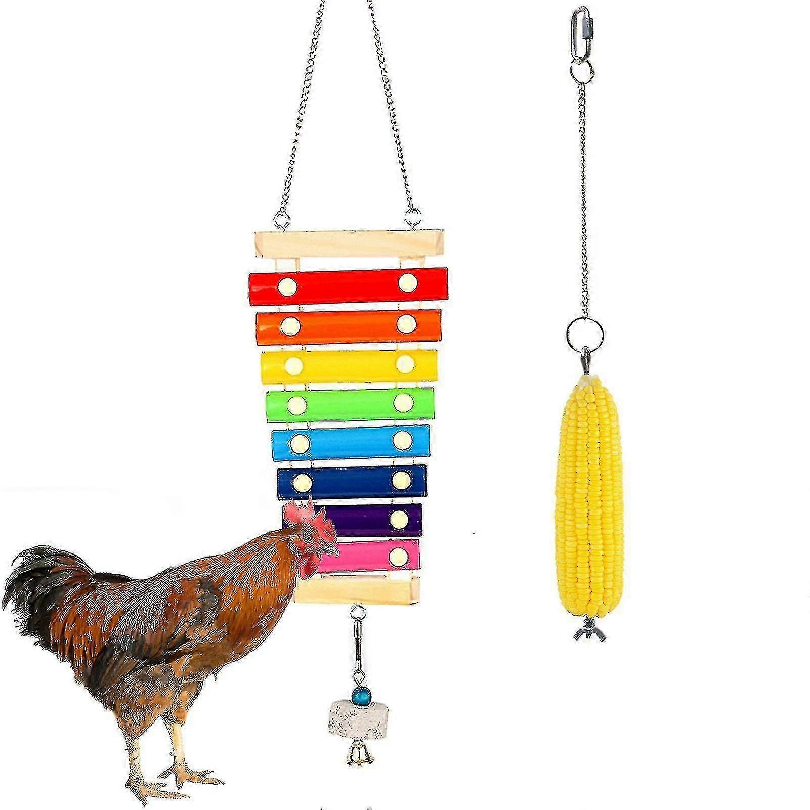 2pcs/set Chicken Suspensible Wood Xylophone Pecking Toy Veggies Skewer Fruit Holder Hens Vegetable Hanging Feeder With 8 Metal Keys YanliesoDescription Specifications:Size and material: Made of a wooden base and a metal key, xylophone is durable to use. The main body of the xylophone is 24 x 14 x 3cm / 9.5 x 5.5 x 1.2 inches. The chain length is 30 cm/11.8 inches. The chicken snack rack is made of stainless steel. The skewer length of chicken snack rack is 7.87 inches and the chain length is 11.81 inches.Function: Crisp sound and bright colors can attract chicken. So, xylophone can bring fun to the chicken by pecking and reducing the boredom of the chicken. In addition, hanging feeder toy can stimulate the chickens natural foraging, gathering and fighting behaviors, and provide entertainment channels for the chickens to vent their emotions and reduce stress.Funny chicken toys: They are specially designed for chickens. With hooks, they can be hung in the chicken house. And when your chicken pecks it, it will make a beautiful sound.Chicken Vegetable Feeder: It is a useful bird foraging toy and treating tool for chickens. This chicken vegetable feeder is designed as a skewer with hanging chains and hooks, which can be easily hung in the chicken house. With hanging design, it prevents chicken from stepping on the food and keeps vegetables and fruits clean and fresh. A group of chickens gathered around a hanging cabbage, vying to peck it and entertain themselves.Item Name: Xylophone Chicken ToyMaterial: Wood, Metal, Stainless SteelFeatures: Nice Sound, Funny Chicken Toys, Easy to Install, RelaxingXylophone Size: 24cm x 14cm x 3cm/9.45 x 5.51 x 1.18 (Approx.)Xylophone Chain Length: 30cm/11.81 (Approx.)Notes:Due to the light and screen setting difference, the items color may be slightly different from the pictures.Please allow slight dimension difference due to different manual measurement.Package Includes:1 x Xylophone1 x Fruit Feeder Skewer (Others Not Included)