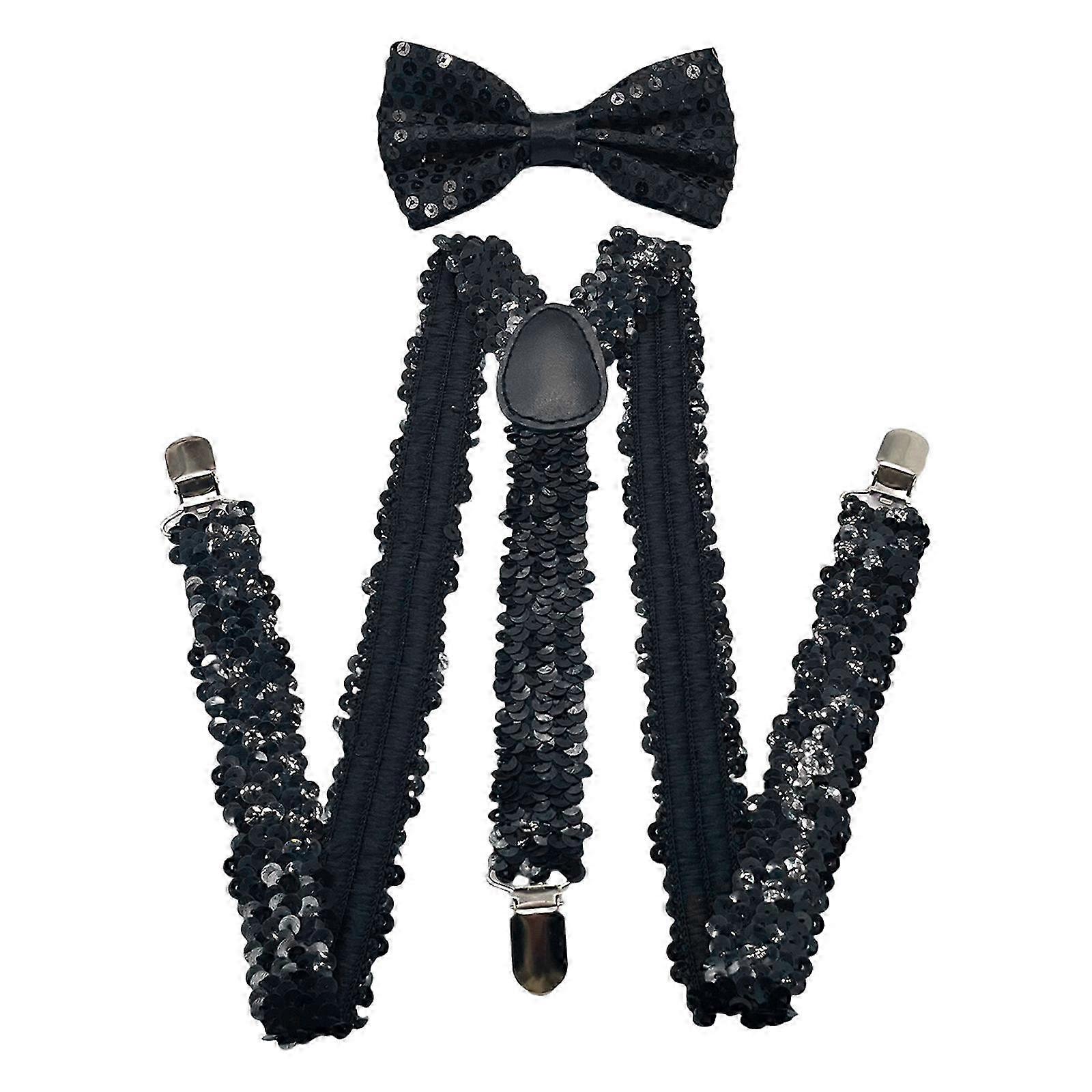 Fashion Sequins Suspenders Tuxedo Bowtie For Men Adjustable Elastic Suspenders Brace For Music Festival Formal Event Silver