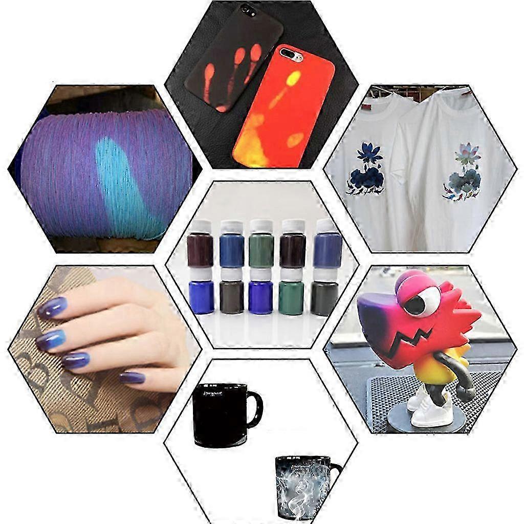 ["Thermochromic Temperature Activated Pigment Powder Heat Sensitive Color Changing Powder for Paint Resin Epoxy Art Craft<br><br>Feature:<br>TEMPERATURE ACTIVATED - <br>This thermochromic pigment changes at 88⁰F (31 ⁰C) <br>from colored to transparent (colored below the temperature, transparent above)<br>NON-TOXIC - <br>This powder is safe for skin contact and uses no harsh chemicals (but not intended for consumption). <br>Great for making color-changing slime, for play dough, Sugru, Polymorph, and nail polish<br>VERSATILE -<br>This heat-sensitive pigment is perfect for a wide range of arts and crafts <br>and mixes well with most mediums, paints, and resins. Make your own heat-sensitive mugs, <br>secret messages, mood rings, nail polish, slime/goo, or whatever you can imagine<br>HIGH QUALITY - This powder is ultra fine with vibrant colors<br>EASY TO USE -<br> Simply add pigment to a clear base and mix well. <br>Keep in mind that mixing generates heat which may temporarily change the color of the mixture.<br> It is recommended to start with a very small amount of pigment and add more until the desired color is achieved. <br>A ratio of 1 part pigment to 20 parts base is a good starting point.<br><br>Item Type :Thermochromic Powder<br>Material: Powder<br>Color:Black,Green,Red,Blue,Yellow,Orange,Pink,Purple<br>Size:<br>10g Per Bottle<br>Bottle Size:5 x 3cm/2\" x 1.2\"<br>More detailed,please see photo.<br>Quantity:1 Pc.<br><br>Note:<br>Size for manual measurement, there may be a 0 to 3mm error, belongs to the normal phenomenon.<br>And due to the difference between different monitors, the picture may not reflect the actual color of the item.<br>Thank you!<br><br>Package includes:<br>1 Pc x Thermochromic Pigment ."]