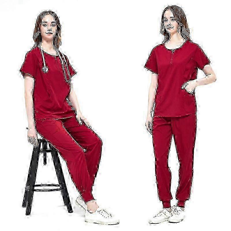 Nurse Work Two-piece Set, Crew Neck Pocket Front Scrub Tops Drawstring Pants Outfits Szfh