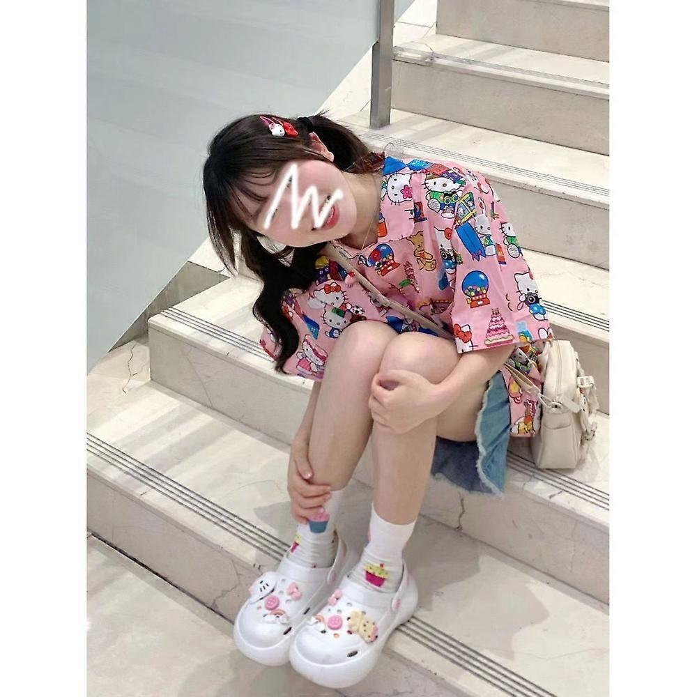 Summer Hello Kitty Anime Kawaii Sanrio Ins Fashion Short Sleeve Shirt Cute Cartoon Print Loose Hoodie Clothes Gifts for Kids