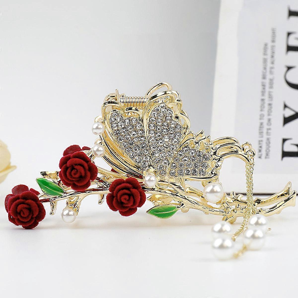Elegant Red Rose Hair Clips For Women, Vintage Style Retro Hairpin For Bride, High-End Shark Clip For Bun