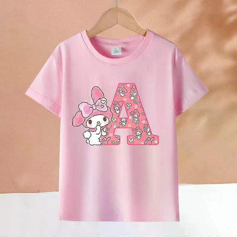 Sanrio Melody Child Pink T-shirt Cartoon 26 Letters Print Short Sleeve Pullover Girls Cute Summer Casual Top Breathable Clothing