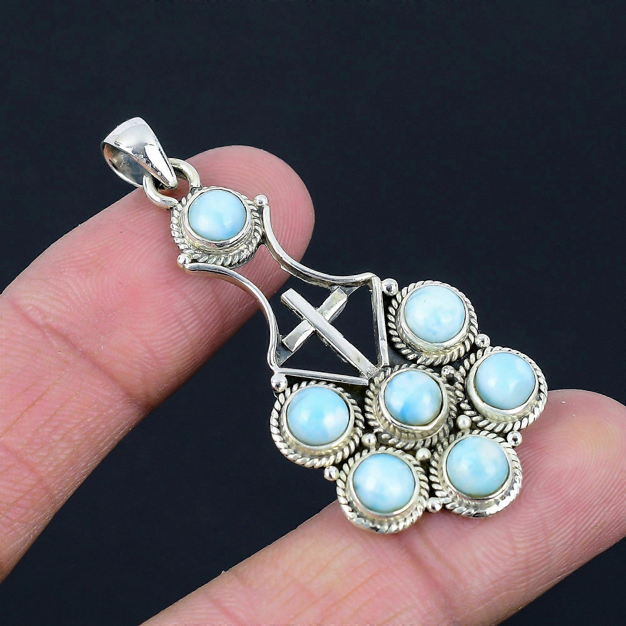 Natural Larimar Gemstone Pendant, 925 Sterling Silver, Cross Religious Handmade Pendant Jewerly Gift For Valentine's Day Gemstone -Larimar Gemstone Creation - Natural Metal - Silver Metal Purity - 925 Sterling Silver Item Gross Weight:- 8.9 Grams (Approx) Item Length - 5.7 cm Handmade Pendant Each Stone Have Their own Color and size, Listing photo showing the design . Each Stone Color Little Bit Differ then the photo of the listing. Benefits of Wearing Larimar Gemstone:- Larimar is best known to be a healing stone, but its metaphysical powers go much deeper. It has effects on four of the seven main chakras: the Heart, the Throat, the Third Eye and the Crown chakra by healing and enlightening. Larimar helps stress-related imbalances, general anxiety and panic attacks. Occasion: Birthday gift, Valentine's Day Gift, Anniversary Gift, Wedding Gift, Engagement Gift, Christmas Gift, Gift For Her, Gift For mom, graduation gift, New Year Gift, Thanksgiving Gift, Housewarming Gift Silver: Silver has significant health benefits that have been used across cultures for centuries. Silver has a proven track record as a powerful antimicrobial agent fighting infections and aiding in cold and flu prevention, wound healing, and more. Silver also helps with internal heat regulation and circulation.