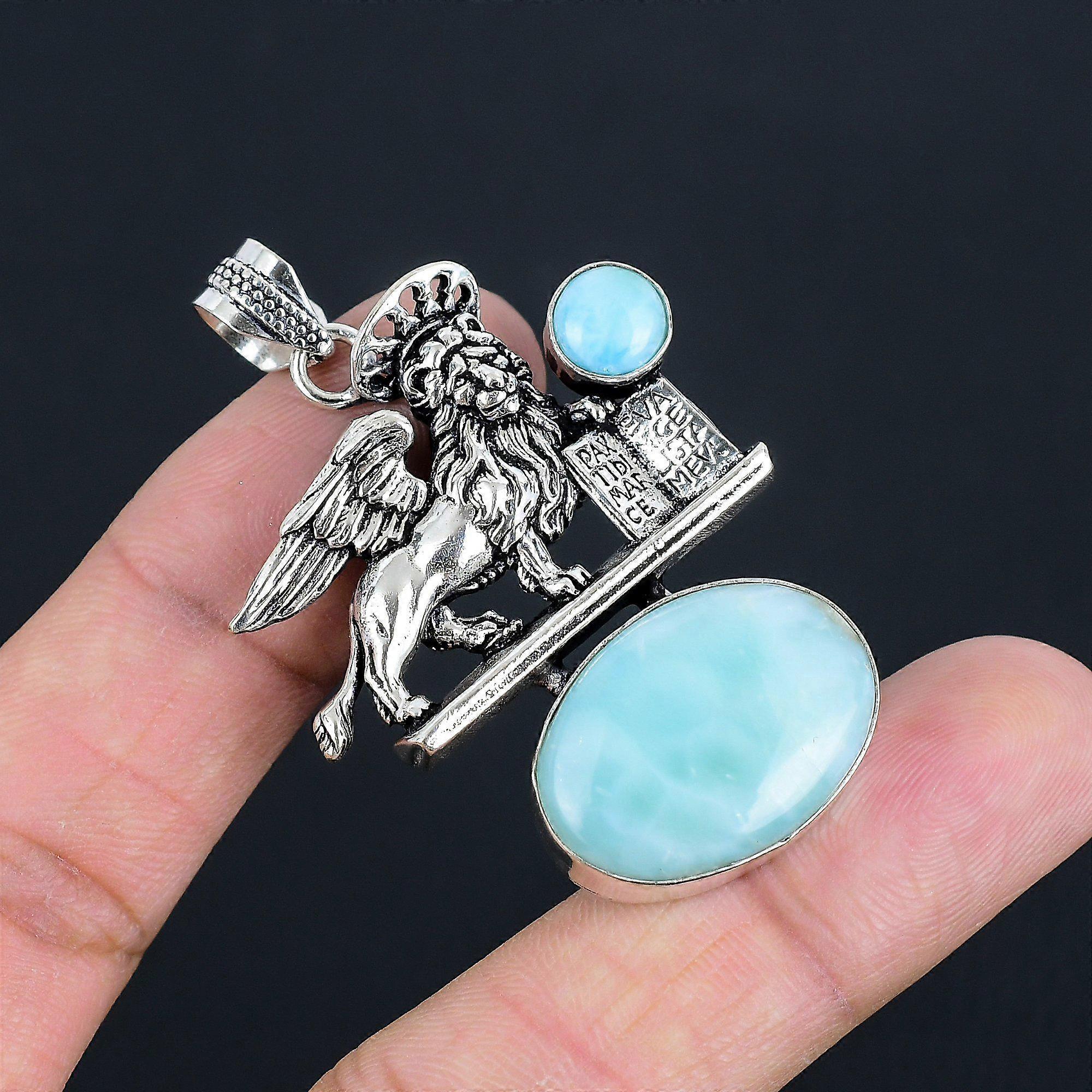 Lion of Saint Mark Larimar Gemstone Silver Pendant | 925 Sterling Silver | Necklace Pendant | Handmade Vintage Pendant Jewelry for Her/him