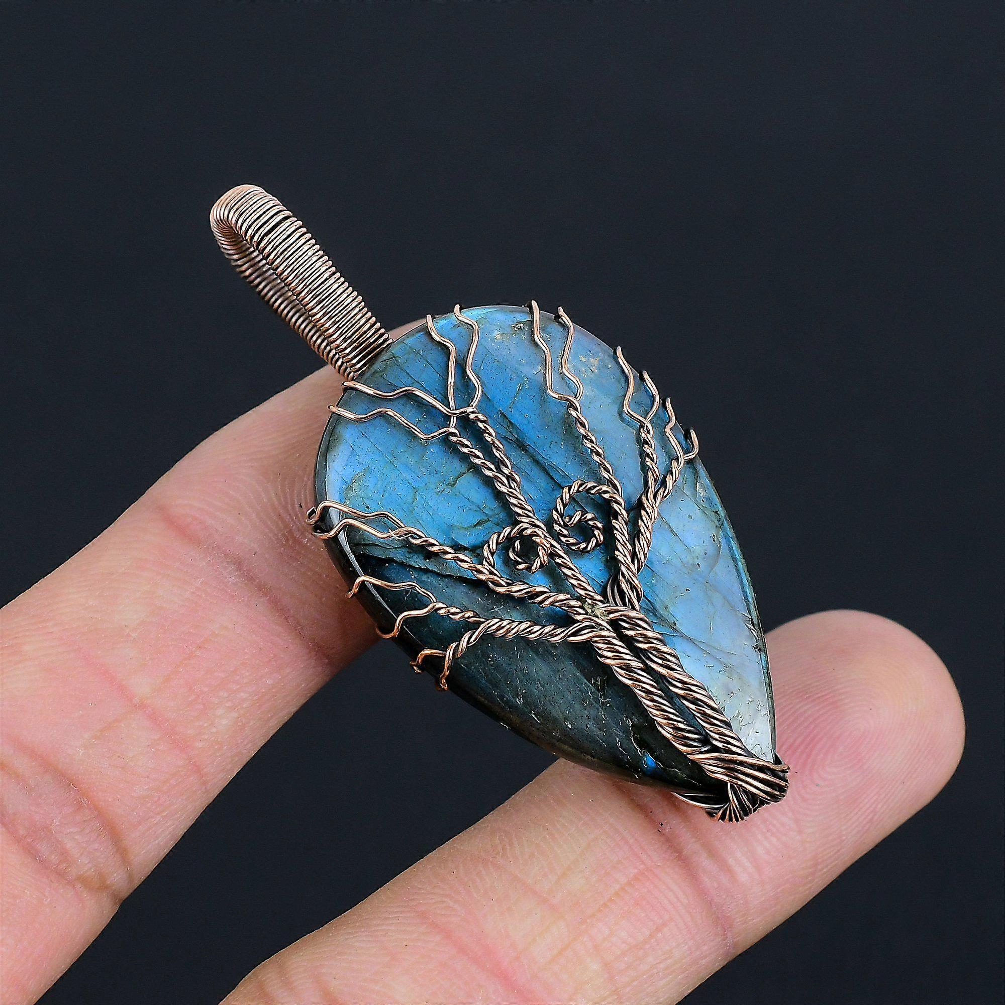 Natural Double Tree of Life Labradorite Gemstone Pendant | Oxidized Copper Wire Wrapped | Necklace Pendant | Copper Jewelry Gift For Her/him