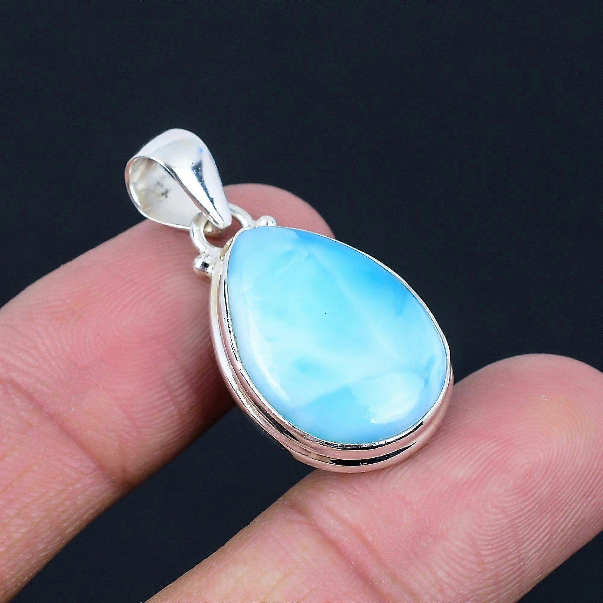 Natural Larimar Gemstone Pendant, 925 Sterling Silver, Teardrop Pear Shape Gemstone, Handmade Pendant Jewelry Gift For Valentine's Day Gemstone -Larimar Gemstone Creation - Natural Metal - Silver Metal Purity - 925 Sterling Silver Item Gross Weight:- 6.43 Grams (Approx) Item Length - 3.6 cm Handmade Pendant Each Stone Have Their own Color and size, Listing photo showing the design . Each Stone Color Little Bit Differ then the photo of the listing. Benefits of Wearing Larimar Gemstone:- Larimar is best known to be a healing stone, but its metaphysical powers go much deeper. It has effects on four of the seven main chakras: the Heart, the Throat, the Third Eye and the Crown chakra by healing and enlightening. Larimar helps stress-related imbalances, general anxiety and panic attacks. Occasion: Birthday gift, Valentine's Day Gift, Anniversary Gift, Wedding Gift, Engagement Gift, Christmas Gift, Gift For Her, Gift For mom, graduation gift, New Year Gift, Thanksgiving Gift, Housewarming Gift Silver: Silver has significant health benefits that have been used across cultures for centuries. Silver has a proven track record as a powerful antimicrobial agent fighting infections and aiding in cold and flu prevention, wound healing, and more. Silver also helps with internal heat regulation and circulation.