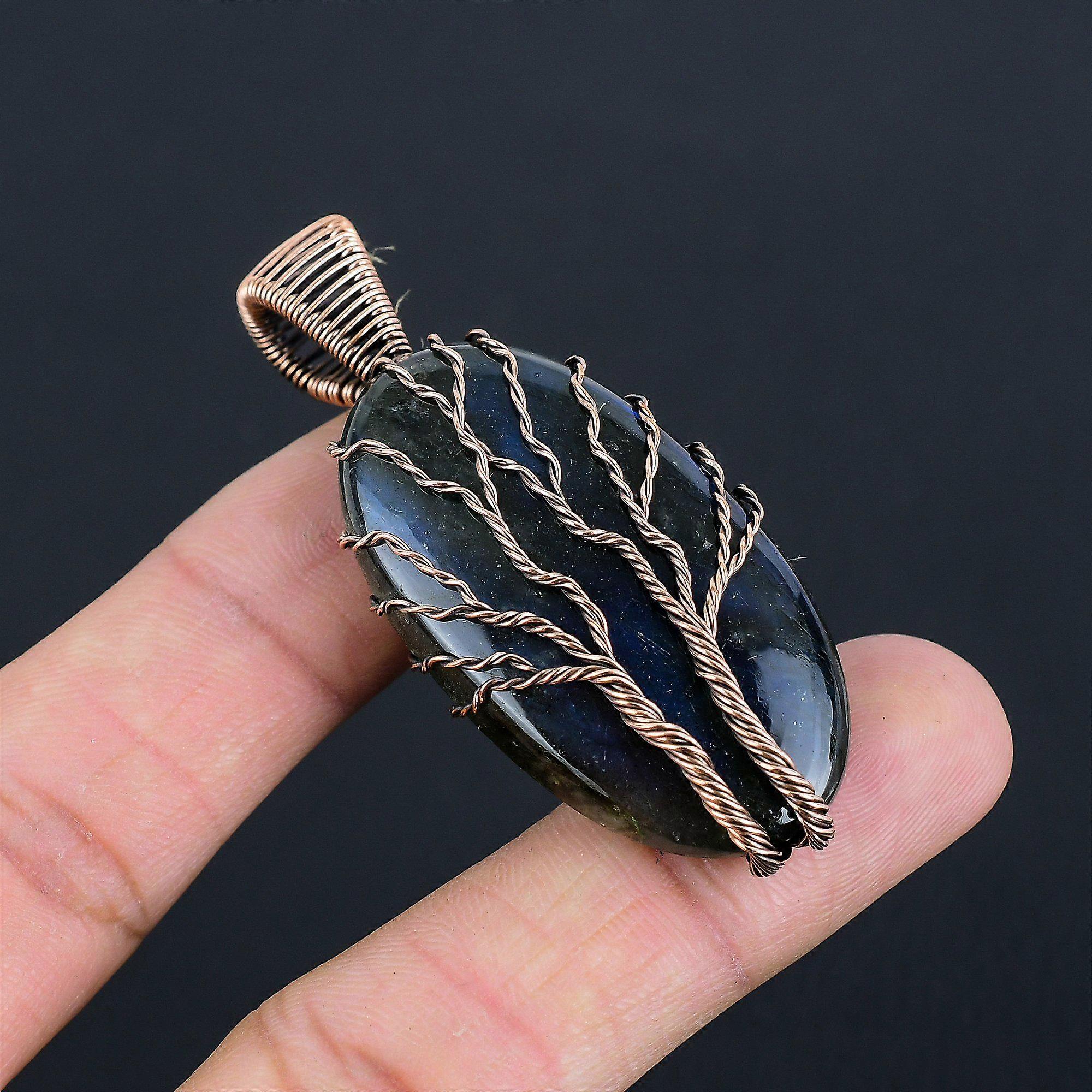 Double Tree of Life Blue Fire Labradorite Gemstone Pendant | Oxidized Copper Wire Wrapped | Necklace Pendant | Copper Jewelry For Her/him Gemstone - Labradorite Stone Creation- Natural Metal - Copper Handmade Pendant Welcome to our little shop, where you can find handmade copper wire jewelry and more, for you and your loved ones. We do accept custom orders also, kindly message us for more. Note :- Due to the natural formation of this gemstone. Slight variation in texture and color but stone shape is same. Benefits of Wearing Labradorite Gemstone:- It helps an individual regain energy while aiding the body and spirit in healing itself. In the metaphysical world, labradorite is considered one of the most powerful protectors. The gemstone creates a shield for auras and protects against negativity of the world. Benefits of Wearing Copper Jewelry:- It's Known to help reduce inflammation, arthritis, headaches, and improve digestions. It helps bring the body back into alignment. Amplifies energy, it is an excellent conductor and helps stimulate the flow energy.