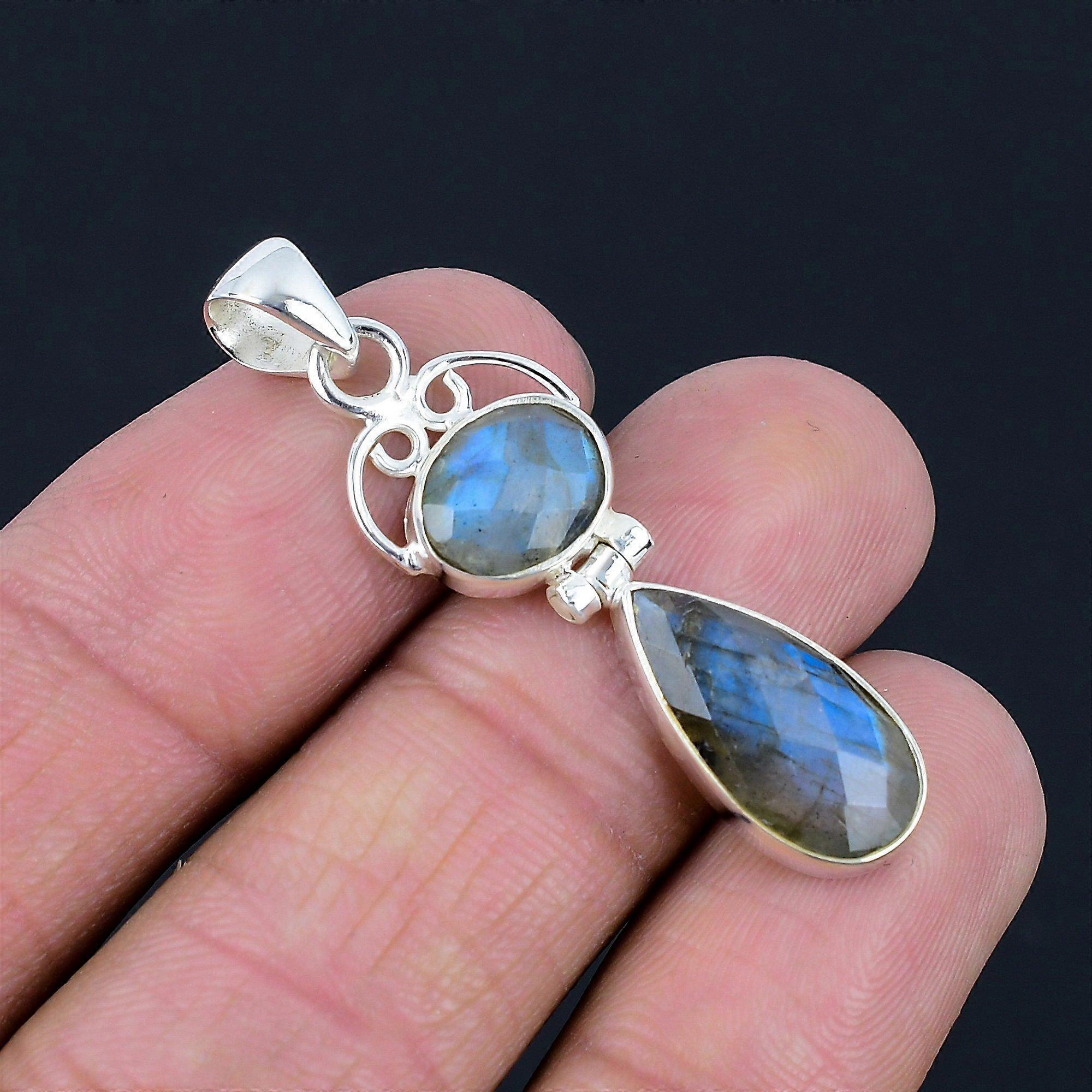 Natural Labradorite Gemstone Pendant, 925 Sterling Silver, Pear Shape Gemstone, Handmade Two Stone Pendant Jewelry Gift For Valentine's Day