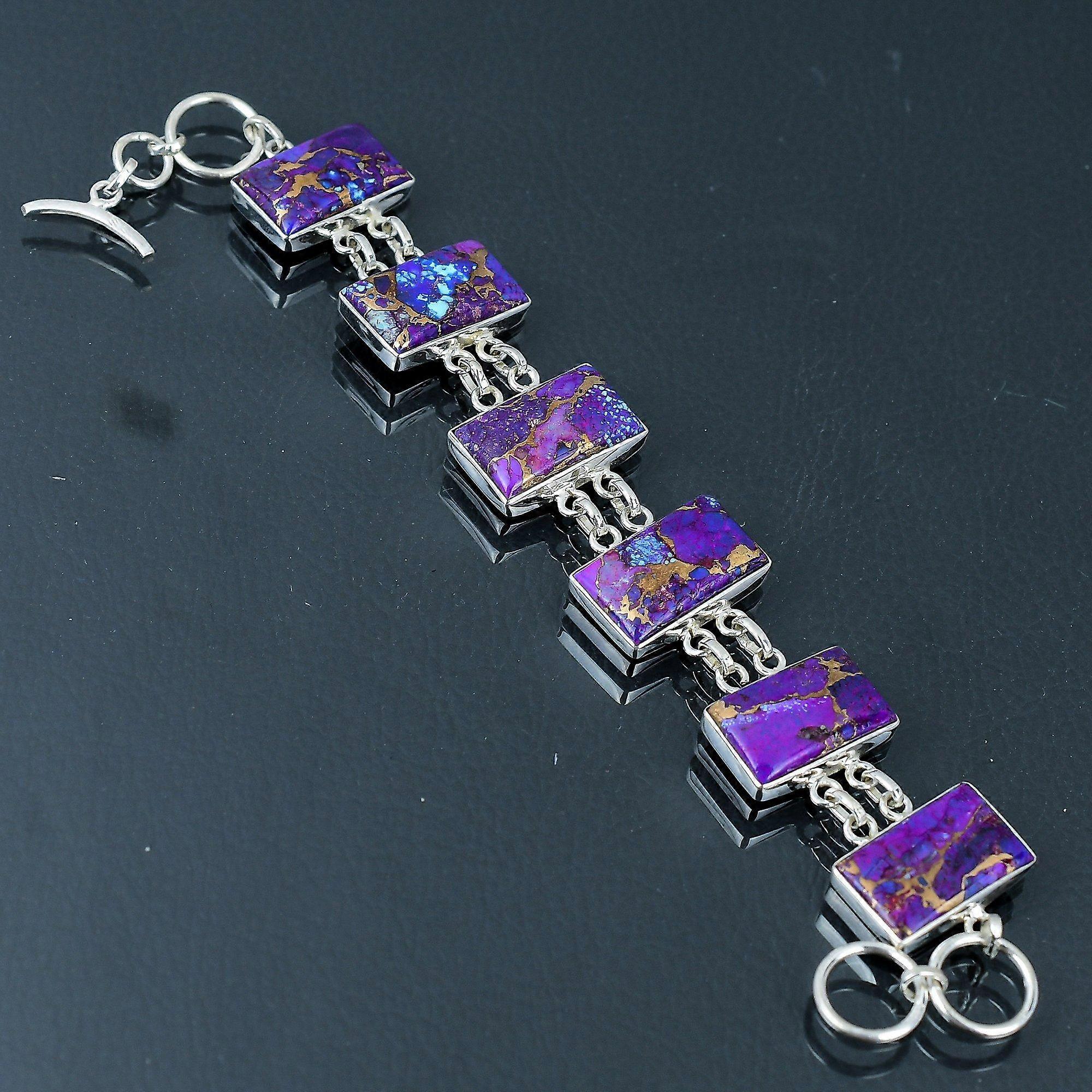 Natural Purple Copper Turquoise Bracelet, 925 Sterling Silver, 7 To 8 Inch, Rectangular Shape Gemstone, Handmade Bracelet Jewelry Gift For Valentine's Day Gem type Copper Turquoise Material Sterling Silver Clasp type Toggle Chain type Link Chain Item Gross Weight:- 23.87 Gram (Approx.). Gemstone Shape:- Rectangle Shape Country of Origin India Handmade Bracelet Each Stone Have Their own Color and size, Listing photo showing the design . Each Stone Color Little Bit Differ then the photo of the listing. Benefits of Wearing Purple Copper Turquoise Gemstone - Copper Turquoise soothes and clears sore throats, purifies lungs, and heals the eyes, as well as cataracts. Copper Turquoise dispels negative energy and is said to be a purification stone. It instills inner calm and by balancing all the chakras. It stabilizes the mood swings. Occasion: Birthday gift, Valentine's Day Gift, Anniversary Gift, Wedding Gift, Engagement Gift, Christmas Gift, Gift For Her, Gift For mom, graduation gift, New Year Gift, Thanksgiving Gift, Housewarming Gift Silver: Silver has significant health benefits that have been used across cultures for centuries. Silver has a proven track record as a powerful antimicrobial agent fighting infections and aiding in cold and flu prevention, wound healing, and more. Silver also helps with internal heat regulation and circulation.