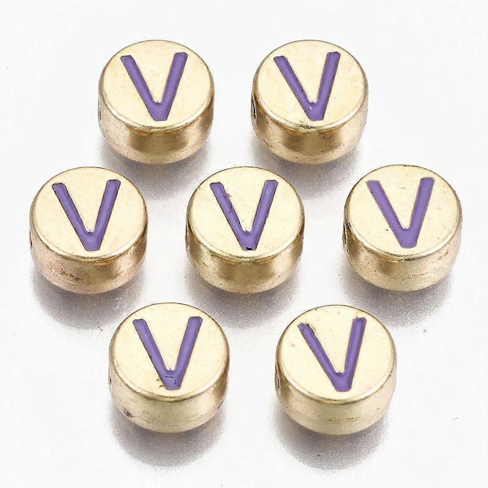 Alloy Enamel Beads Cadmium Free Lead Free Flat Round with Initial Letters Light golden Medium Purple Letter.V 8x4mm Hole: 1.5mm