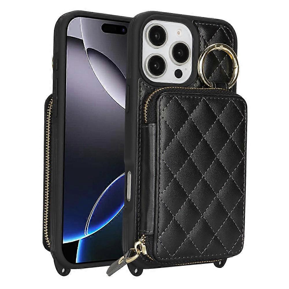 Compatible For iPhone 16 Pro Max Case Ring Holder Zipper Pocket Kickstand Leather Back Phone Cover with Shoulder Strap