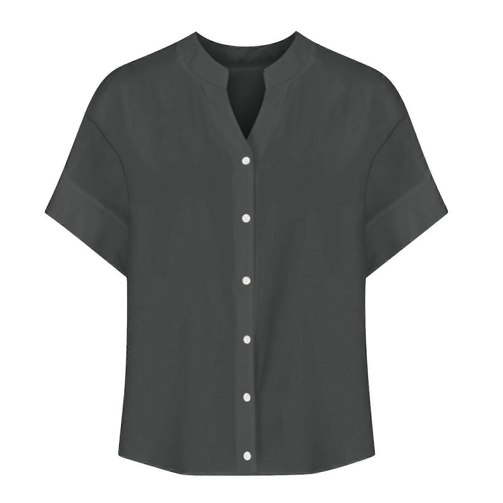 Women Shirt Round Neck Short Sleeve Buttons Closure Shirt Tops Solid Color Loose Fit Versatile