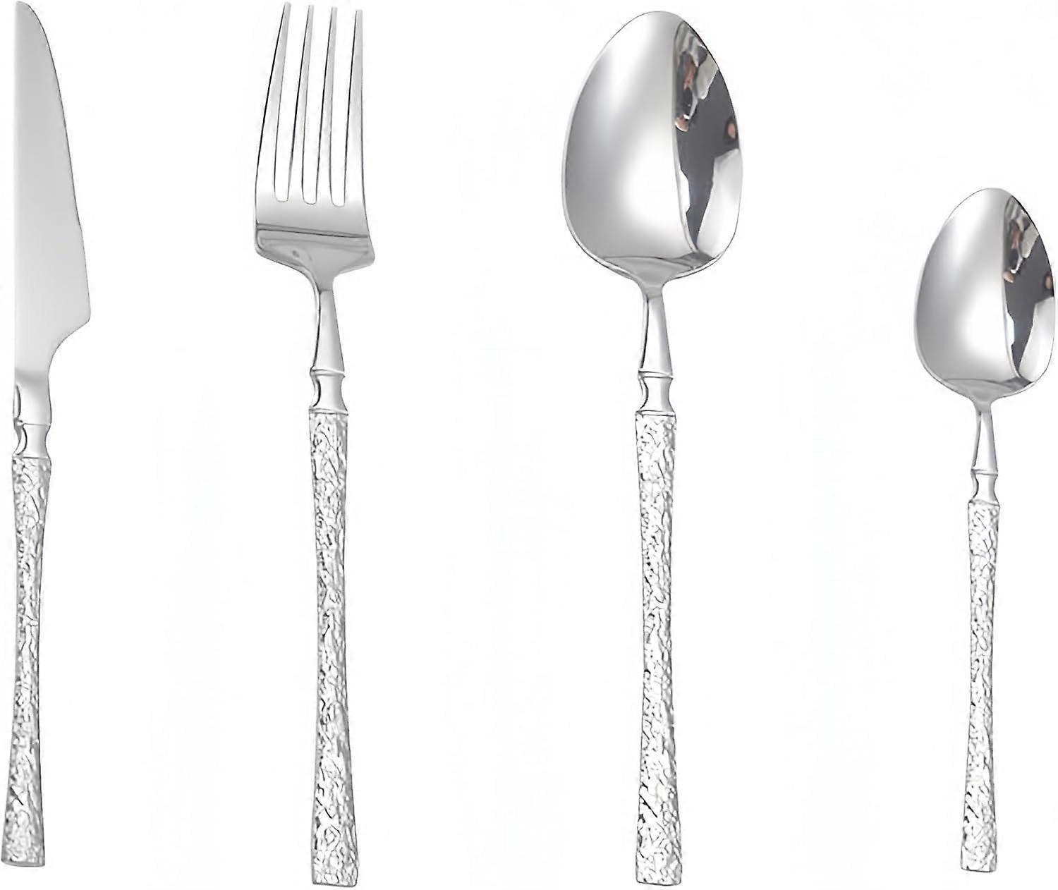 【HEALTHY MATERIALS】Dinner Spoons made of quality 304 stainless steel, healthy and durable, Improved polishing process to get better anti-rust ability, suitable for adults and children to use, completely dishwasher safe for saving your trouble.【CLASSIC DESIGN】The unique hammer pattern makes it different from other silverware, Vintage and elegant, Smooth mirror polishing gives it a shiny metallic texture, Cutlery allows you to easily try the retro and elegant style table setting, Unique pattern brings unique dining experience.【ERGONOMIC HANDLE】Featuring a unique hammered edge, these Heavy Table Spoons add a touch of elegance and sophistication to any table setting. The textured design not only looks visually appealing but also provides a better grip, making it easier to handle and serve food with confidence.【MULTIPURPOSE USE】Which can be used as a long spoon for stirring, bar spoon, cocktail mixing spoon,long handle spoon, tea spoons, long coffee spoons, long shake spoons,and big ice cream spoons. At the same time, outdoor carrying is also very portable and practical.【GOOD GIFT】are the perfect gift for family, lover, wife, friends, and colleagues. Each Serving Spoons is carefully inspected before shipping to ensure that you receive the Serving Spoons intact.