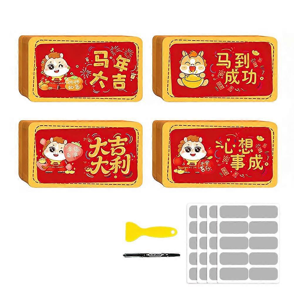 Description 1. Festive Scratch Cards: Discover a delightful set of **40 custom scratch cards**, featuring vibrant red and orange designs adorned with auspicious Chinese blessings like "Good Luck in the Year of the Horse," "Instant Success," and "May All Your Wishes Come True." These unique cards are perfect for adding of surprise and joy to any celebration or as a fun motivational tool. 2. Material & Dimensions: Each scratch card is crafted from quality paper, ensuring a pleasant writing and scratching experience. The convenient size of these cards measures **12 x 8 cm (approximately 4.72 x 3.15 inches)**, making them easy to handle, store, and distribute for various occasions. 3. Complete Kit Included: Your purchase comes with everything you need to start creating instant fun! We've included a handy scratcher tool, a convenient dual-tip marker pen for writing your personalized messages, and an extra **20 scratch-off films**, ensuring you have ample supplies for all your reward and game ideas. 4. Versatile Application: These unique scratch-off cards offer endless possibilities for engagement. They are perfect for motivating students in classrooms, creating interactive games for family fun and festive gatherings, or as innovative incentives for company events and team-building activities, bringing excitement to any setting. 5. Simple & Fun Personalization: Personalizing your scratch cards is incredibly simple. Just write your desired reward or message in the blank area, apply one of the scratch-off films over it, and you're ready to surprise! The recipient then uses the included scratcher to reveal their hidden prize, adding of anticipation and excitement. Package list * 40 x Scratch Cards * 1 x Scratcher Tool * 1 x Dual-Tip Marker Pen * 40 x Scratch-off Films