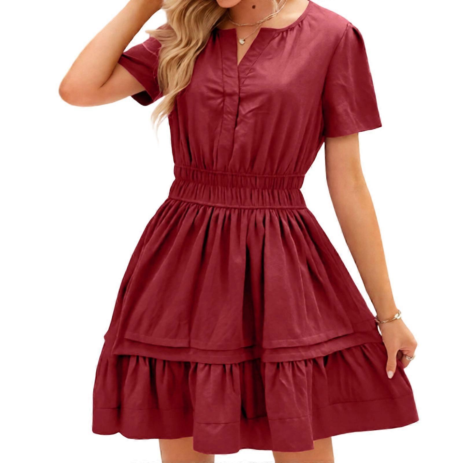 Women's Casual Dresses V Neck Short Sleeve Sundress Smocked Waist A Line Tiered Dress Burgundy XL