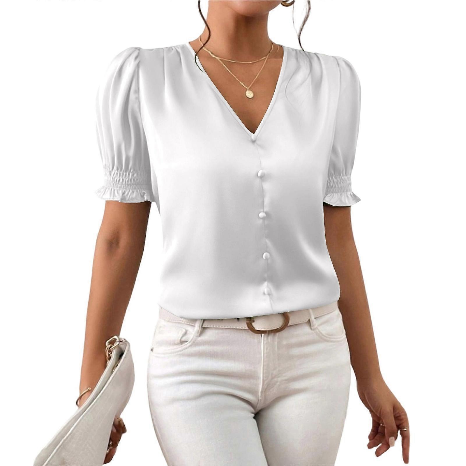 Womens Blouses Dressy Casual Satin V Neck Short Sleeve Shirts Business Casual Tops for Women White XS