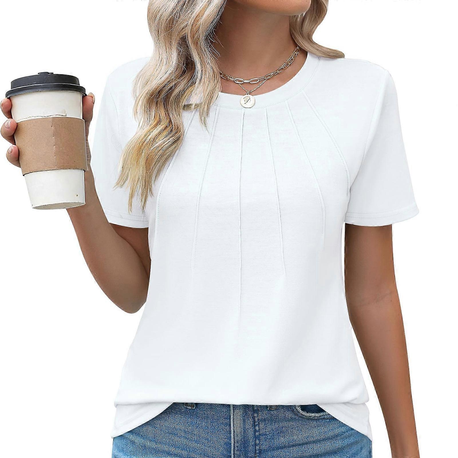 Womens Casual Neck Short Sleeve Pleated Tops Blouses Fashion Clothes White XL