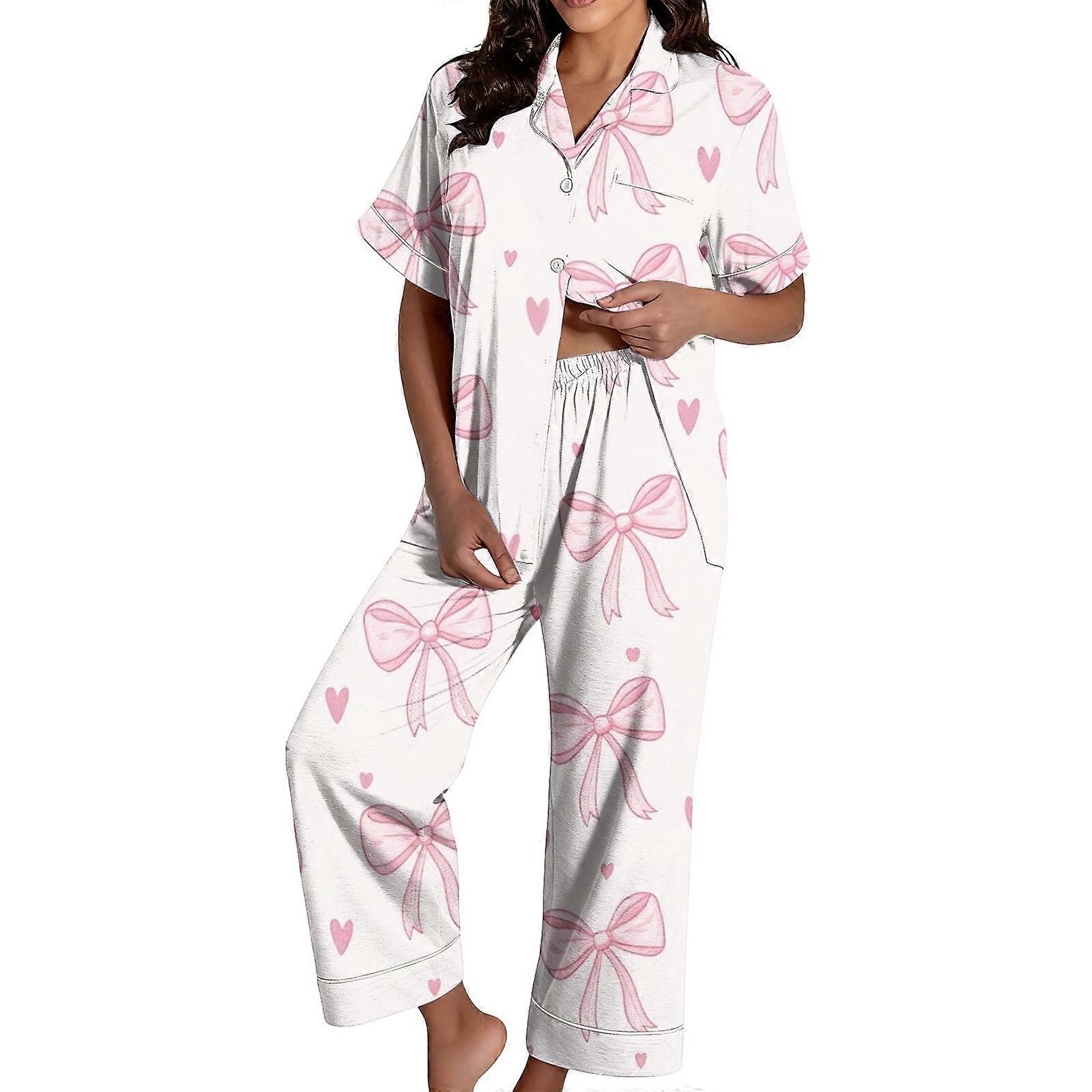 Women's Valentine's Day Pajama Set: Satin Heart Print Button-Down Shirt and Pants, Short-Sleeved Casual Wear White XL