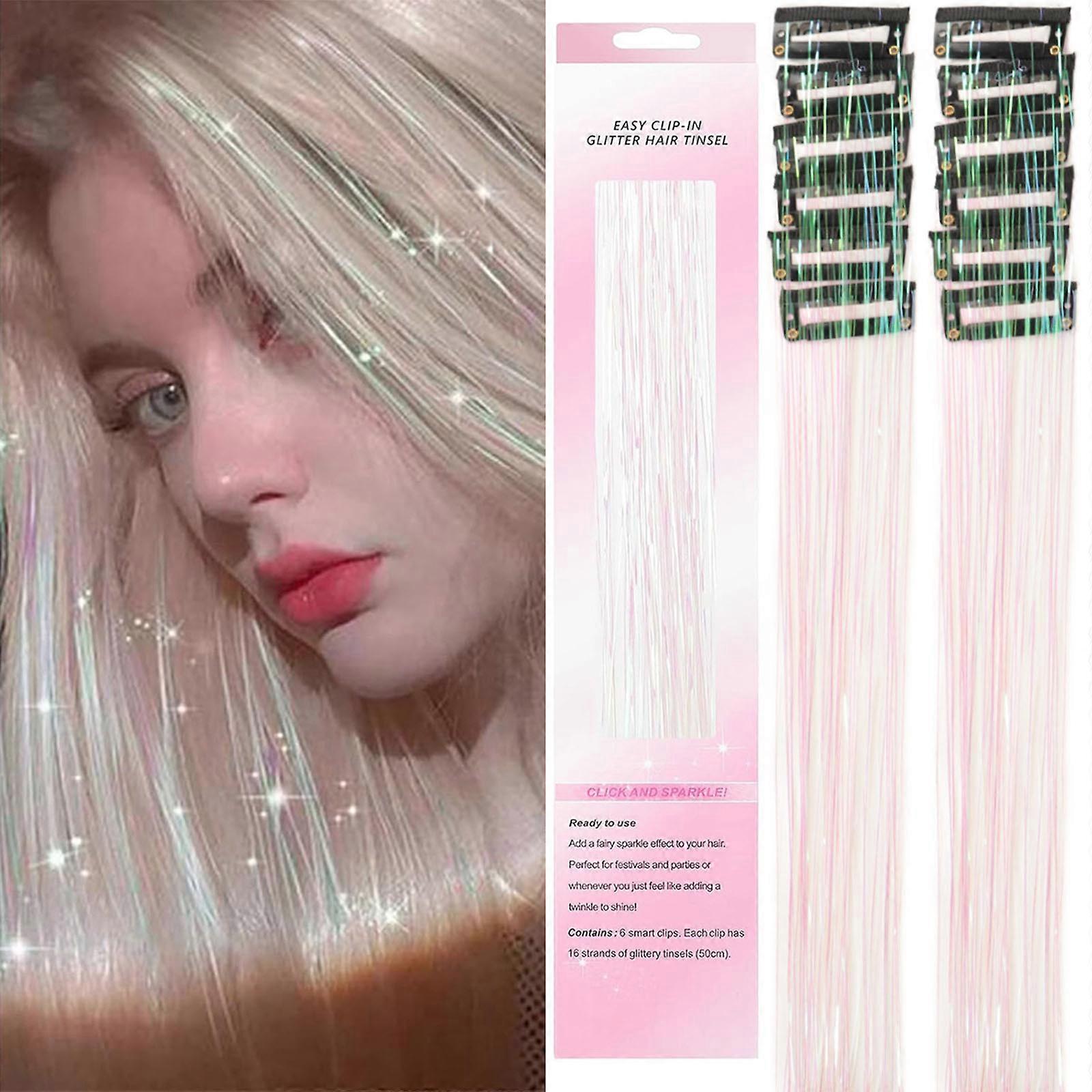 12PCS Glitter Tinsel Clip On Hair Extension Ornament Glitter Filament High Temperature Silk for Children Daily Activity Pearlescent white