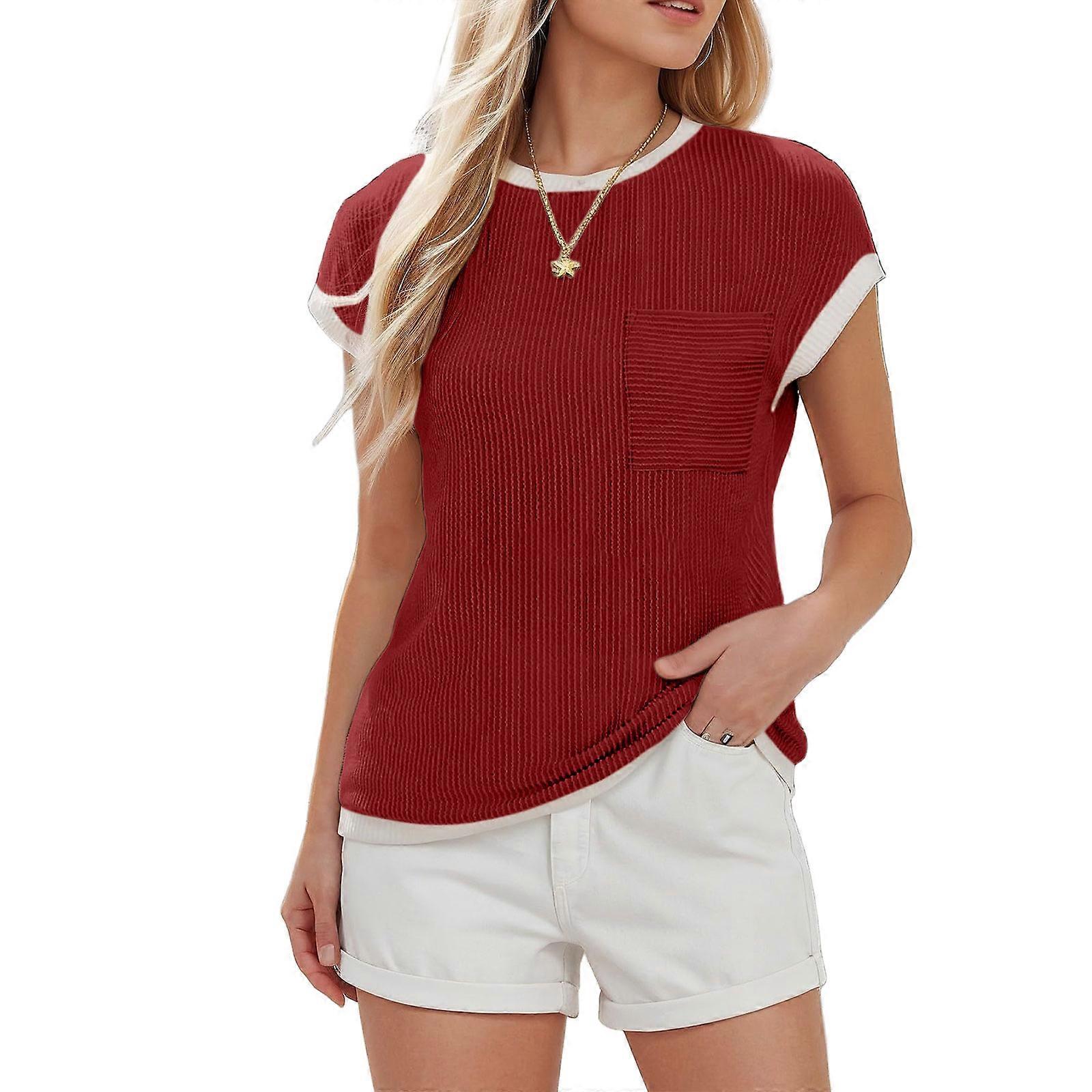 Women's Short-Sleeve T-Shirt, Crew Neck, Color-Blocked Ribbed Knit T-Shirt, Trendy Top Burgundy XL
