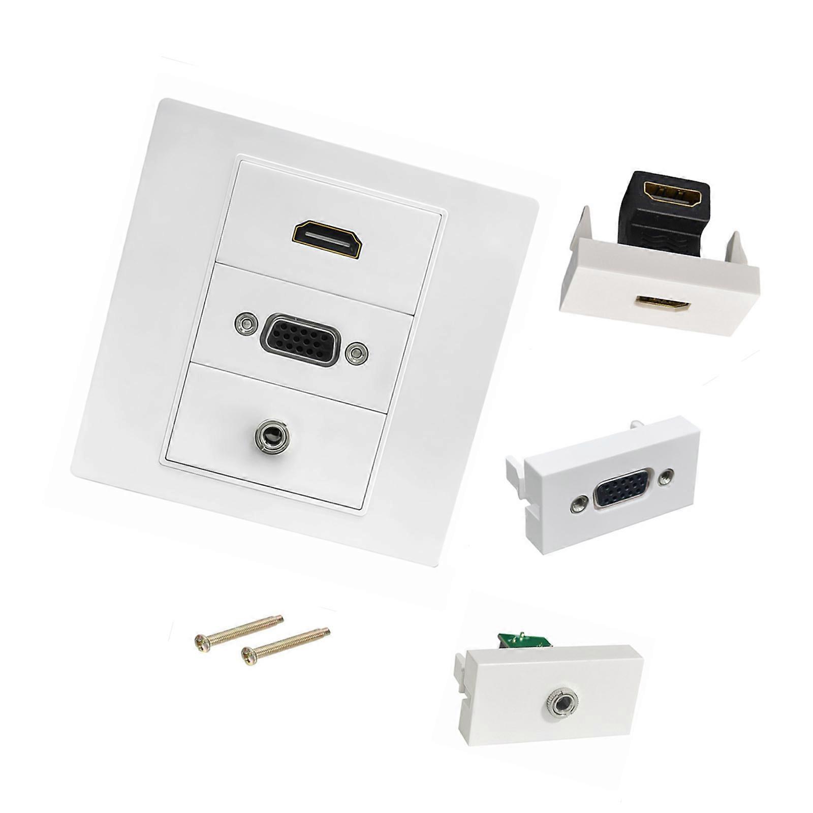 Features: This plug and play multimedia wall plate integrates HDTV, VGA, 3.5mm sound port for versatile connectivity without soldering, ensuring seamless device integration. Featuring a standard 86mm size, durability PC plastic, and metal components, it offer easy installation, easy maintenance, and long lasting performances for reliability use. Designed for enthusiasts, homeowners, and professional in offices or educational settings, it caters to users seeking visual solution. Ideal for home theaters, conference room, and classrooms, this panel supports high clear video and stereo sound connection in diverse environment. Its sleek, modern design and robust construction enhances both functionality and aesthetics, making it practical for any decor while maintaining compatibility with various equipment. Specifications: Component: ABS, metal Size:Approx.86x86mm/3.39x3.39inch Color: white Interfaces: HDTV, VGA, 3.5MM Mounting Spacing:60mm/2.36inch Option Type:HDTV Straight Connector, HDTV Bent Connector; Applicable scenario:home theater,office environment,multimedia presentation, Package Includes: 1pc Multimedia Wall Panel 2pcs Screw note: Please allow 1-3cm errors due to manual measurement. Due to the differences between different monitors, the picture may not reflect the actual item color.