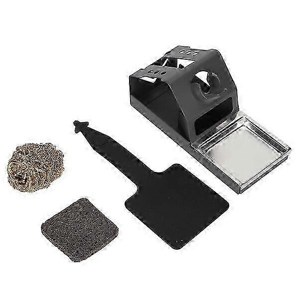 1. Project type: Soldering iron stand<br>2. Product materials: Zinc alloy, silicone, sponge<br>3. Soldering iron station dimensions: Approximately 16 x 6.7 x 7.2 cm / 6.3 x 2.6 x 2.8 inches<br>4. Packaging list:<br> - 1 x Soldering iron stand<br> - 1 x Silicone pad<br> - 1 x Sponge<br> - 1 x Lead - free wiping cloth<br>5. Material: Multifunctional soldering iron stand made of zinc alloy, which is strong and durable.<br>6. Application: It is designed with a soldering iron handle holder and multiple holes for spare T12 soldering tips.<br>7. Multifunctional features: Anti - static, high - temperature resistant, corrosion - resistant, and non - deformable.<br>8. Easy to clean: The silver tray is made of zinc alloy and can be placed in a cleaning sponge.<br>9. Safety: The stand base is designed with a lower center of gravity and increased weight, allowing the stand to be firmly fixed on the table. This can prevent the stand from easily tipping over during operation, further improving user safety.
