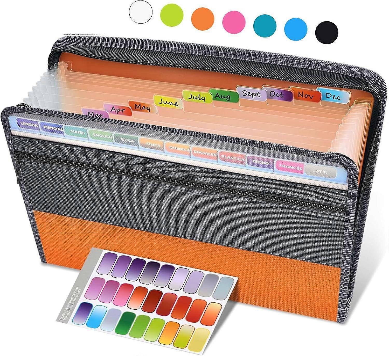 Accordion-style document organizer with security zipper, 13 expandable folders with 13 pockets, front pen pocket, and portable calendar.