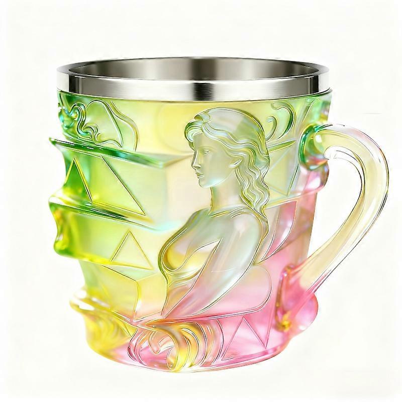 1. Gradient Iridescent Glass Texture: Crafted from premium handmade glass, this mug boasts a unique natural gradient effect, transitioning from yellow-green to pinkish-purple. Under light, it radiates a crystal-clear, flowing luster. The transparent body and softly transitioning colors make it feel like a work of art in your hand. 2. Fusion of Classical Relief and Modern Design: One side of the mug features a delicate relief portrait depicting a serene and peaceful woman with flowing hair, the lines soft and delicate. The portrait is surrounded by abstract geometric triangles and flowing curves, cleverly combining the beauty of a classical figure with modern decorative art to create a rich visual depth and narrative. 3. Exquisite Craftsmanship and Practical Aesthetics: This mug is entirely handmade, featuring an ergonomically designed curved handle for a comfortable grip. The rim has a metallic enamel finish, contrasting with the body and adding a touch of refined elegance. Whether used as an everyday coffee or tea mug, or as a home décor or art collectible, it adds a unique touch of color and warmth to life. This coffee mug is made of high borosilicate glass, which can withstand temperatures up to 180°C and is a safe material. With a capacity of 200 ml, it's suitable for everyday use, holding coffee, tea, milk, juice, and other beverages.
