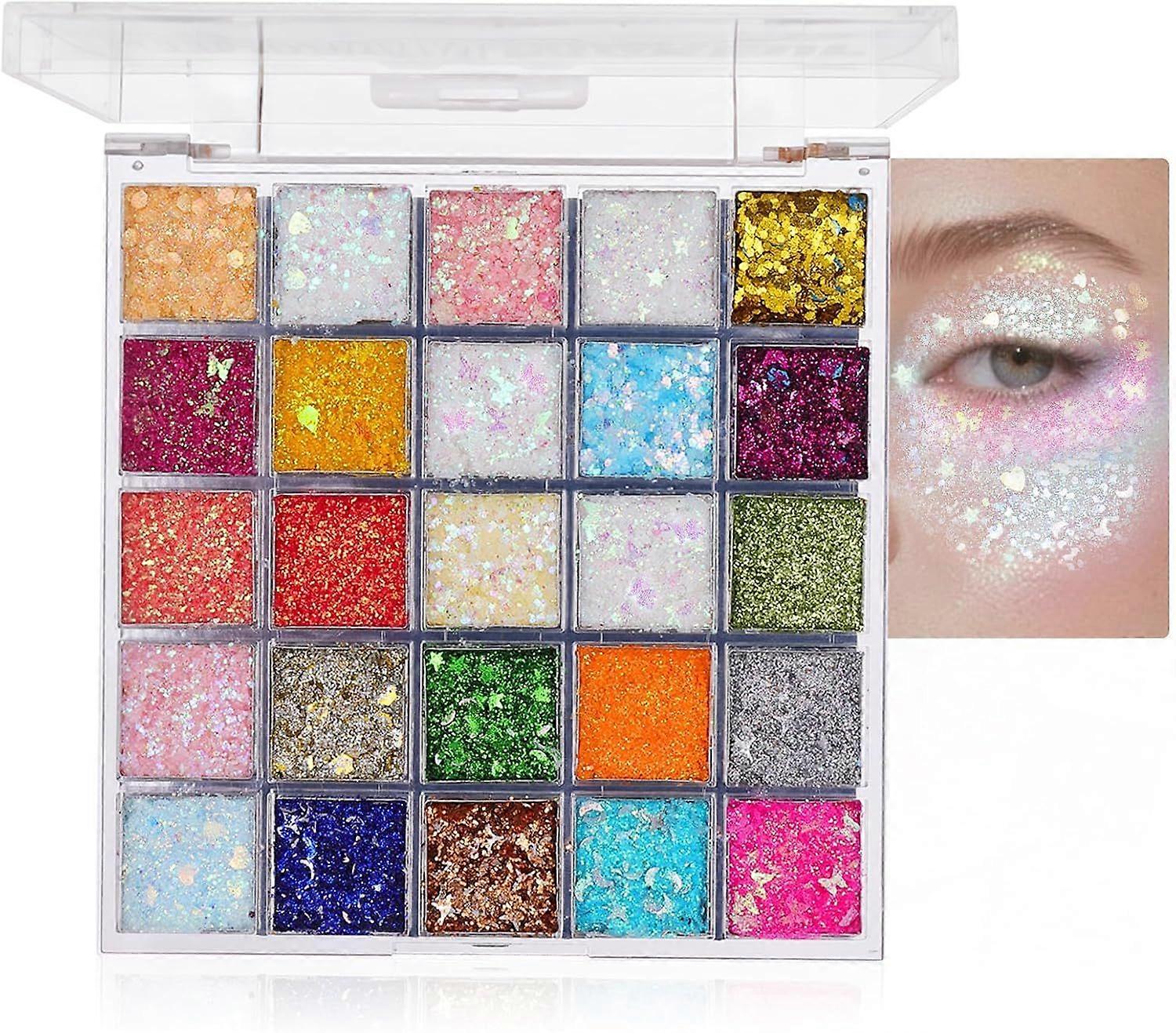25 Colors Glitter Gel Palette: one palette offers 25 unique colors of glitter and various shapes of glitter. There are bright transparent colors, bright and playful colors, and bright colors to chrome. There are surprises such as the moon, stars, butterflies, hearts, as well as irregular shapes of scale, circular, hexagonal and fine. With it, you can freely combine, fully explore the endless possibilities of glitter on the face, hair and body! IDEAL CHOICE FOR FACE AND HAIR - The gel has a smooth and sticky texture, so it won't scratch your skin. Simply apply it with your fingers and it adheres firmly and permanently to the skin or hair. The comfortable and soft application process allows you to easily achieve an excellent effect of festive glitter makeup. It can be easily removed with makeup remover products after use. Unique Design - The unique design of the transparent color palette gives you more colors and shapes of sequins. The palette is transparent, compact and exquisite, making it easy to carry. Whether you are traveling or waiting, at music festivals or festival events, you can take it with you without worries. It will add a shiny charm to your makeup. SUITABLE FOR ALL AGES - Glitter gel ingredients are safe and non-irritating. The gel is soft and pleasant to the face and skin. Girls, women and the elderly can use it with confidence. No brushes, no glue and no makeup skills required. Apply it with your fingers and it will shine on the skin for a long time. Shine - Glitter of different colors and shapes meet the makeup needs of many occasions and is bold enough for festival makeup. Whether it is for daily life, stage performances, parties, carnivals or Halloween, they can make you infinitely charming and radiant in the crowd.