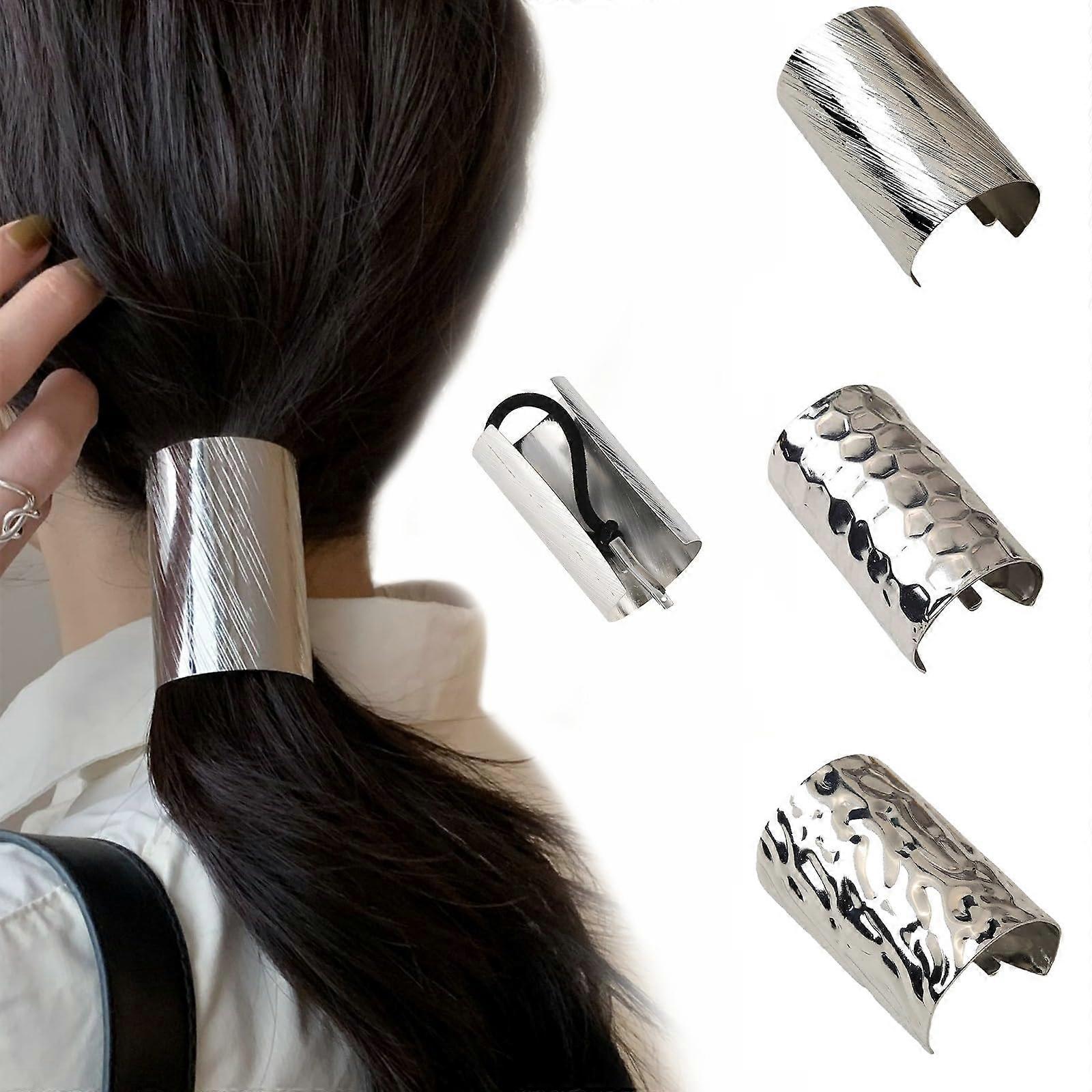 Metal Hair Ties Gold and Silver Ponytail Cuffs for Women, Elegant Geometric Design, Set of 3