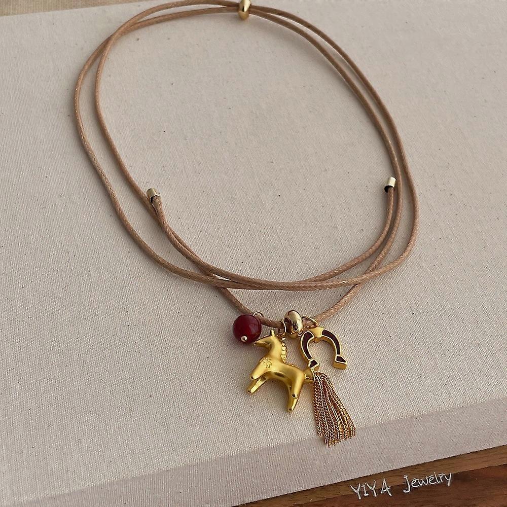 Minar Funny Metallic Cartoon Horse Multi Tassel Beads Pendant Necklaces for Women Female Adjustable Long Wax Rope Chain Chokers