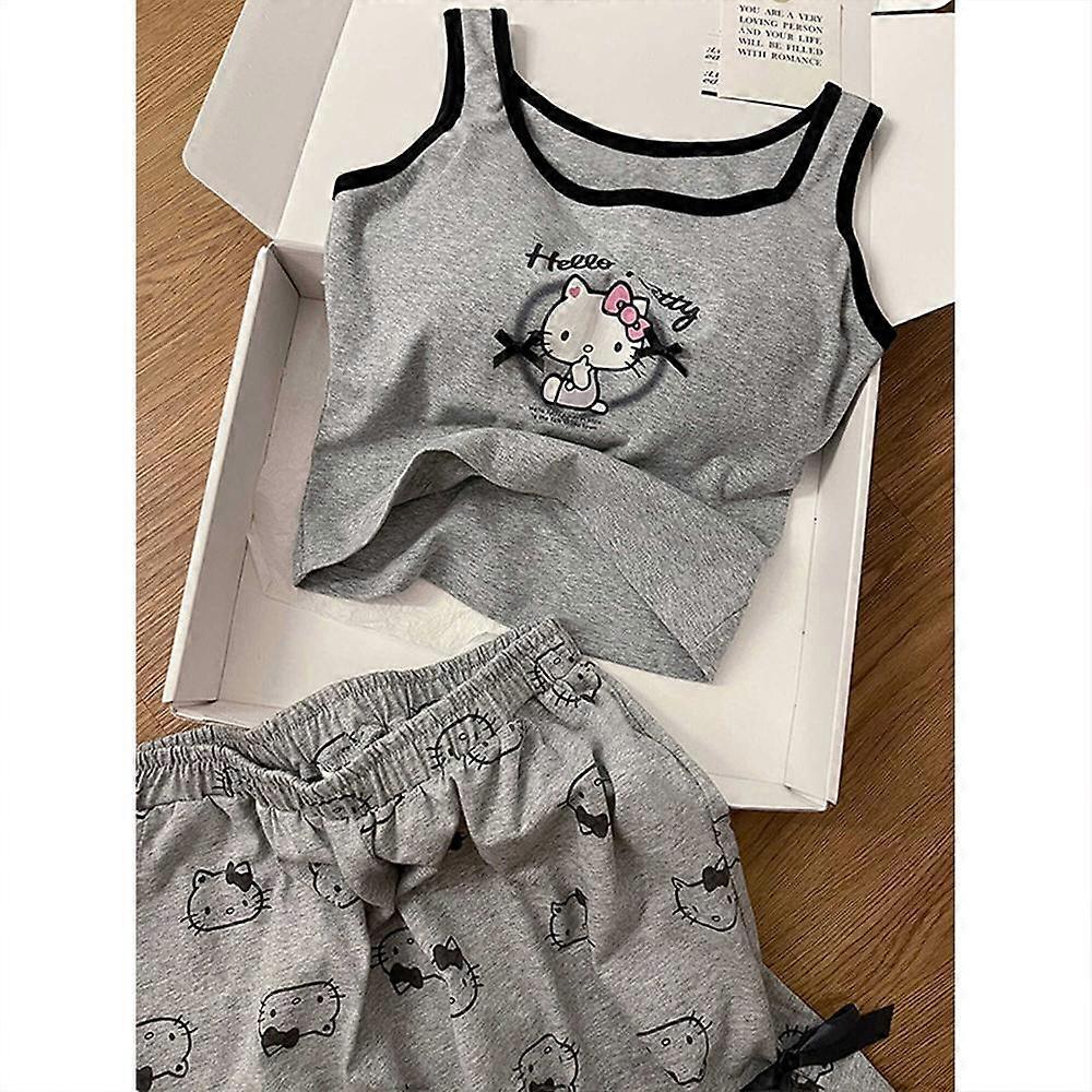 2Pcs Anime Sanrio Hello Kitty Casual Pajamas Suit Sleeveless Pad Tops Shorts Girls Bowknots Grey Sleepwear Student Women Clothes