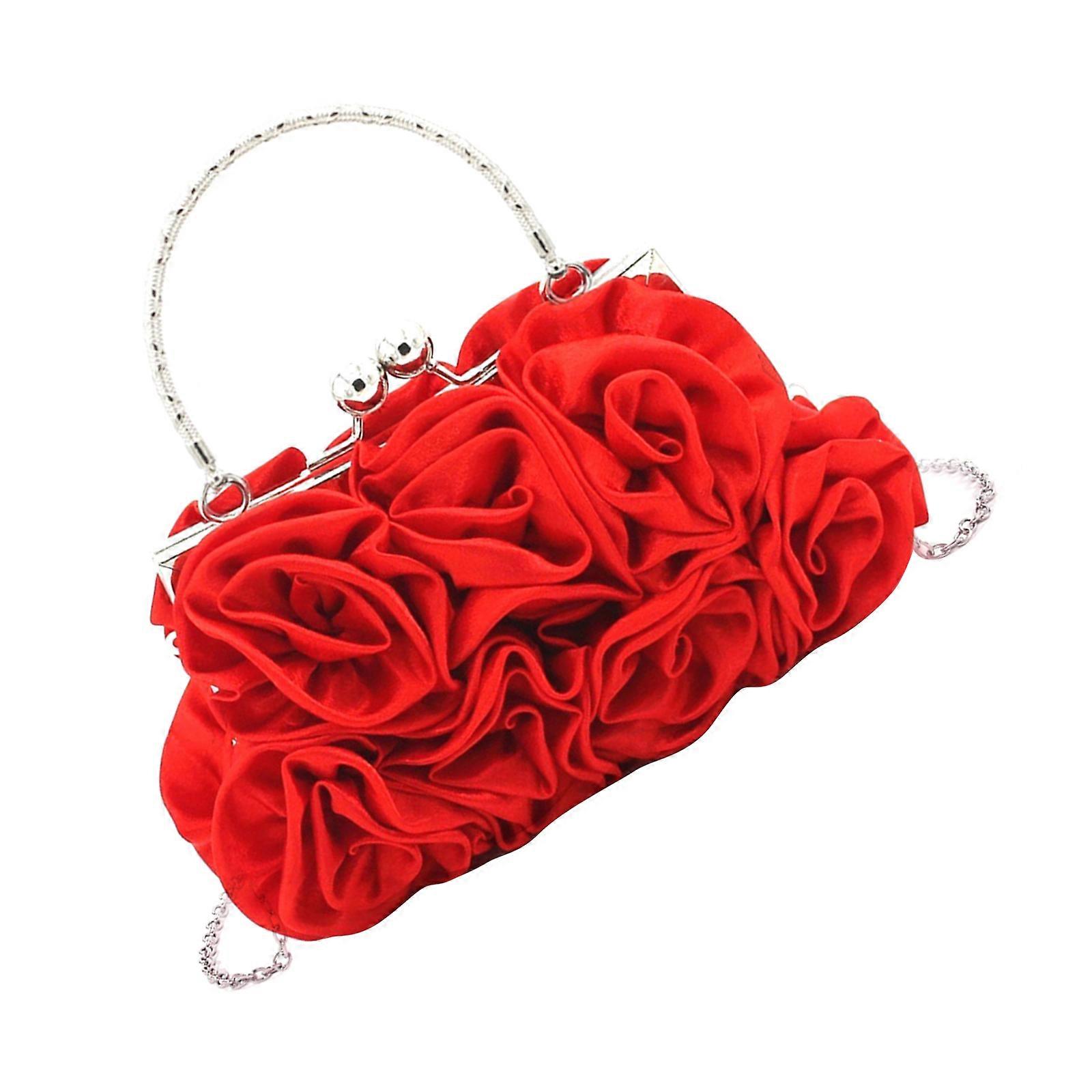 Women's Evening Clutch Bag 3D Rose Floral Satins Small Purses with Detachable Chain Strap for Wedding Parties Prom Red