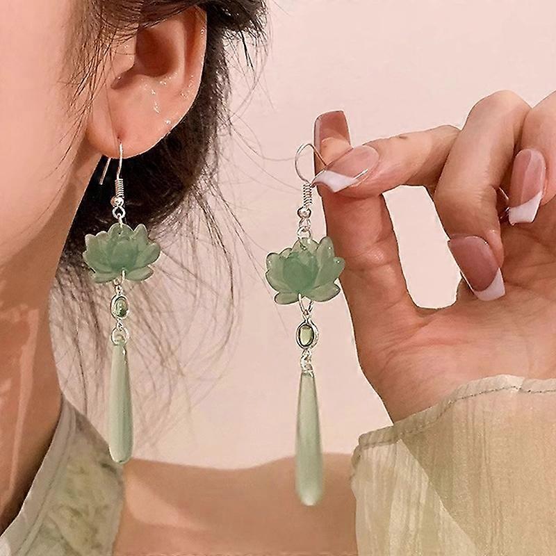 1Pair Lotus Pendant Tassel Earrings; Chinese-inspired Women Girls Retro Style Long Drop Elegant Gifts