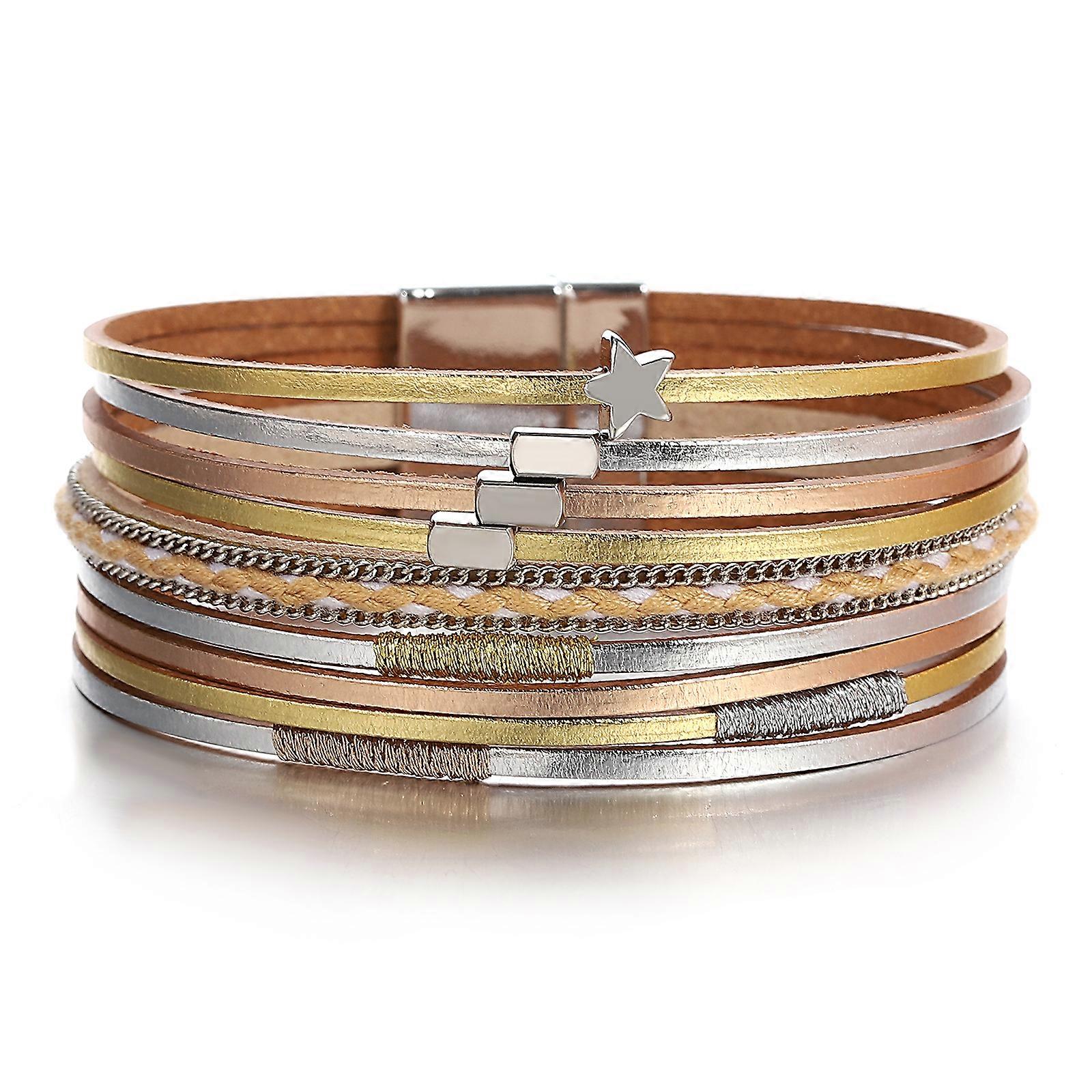 Amorcome Five-pointed Star Leather Bracelets Multi Layer Charm Bracelets For Women Classic Wraps Bangle Magnet Clasp Jewlery