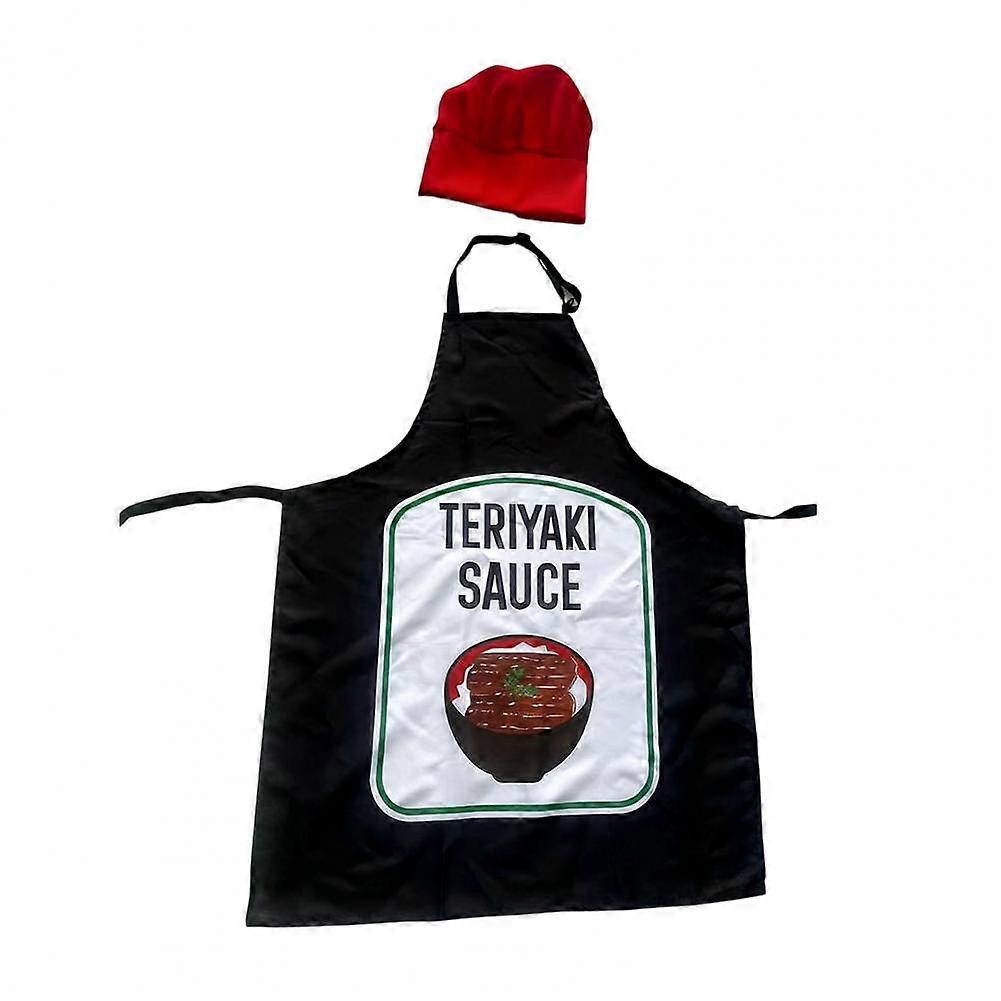 Teriyaki Sauce Apron Chili Bbq Teriyaki Sauce Kitchen Apron with Hat for Christmas Halloween Cosplay Party Adjustable Strap