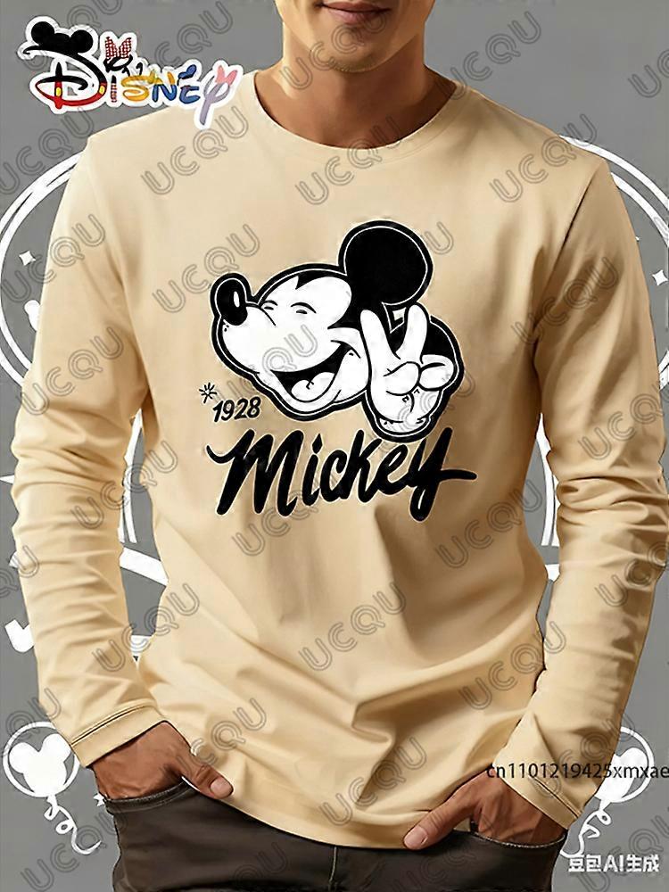 T-shirt �� manches longues pour hommes, nouvelle mode d'automne, motif Disney Mickey imprim��, couleur unie, col rond, d��contract��, Vintage, s