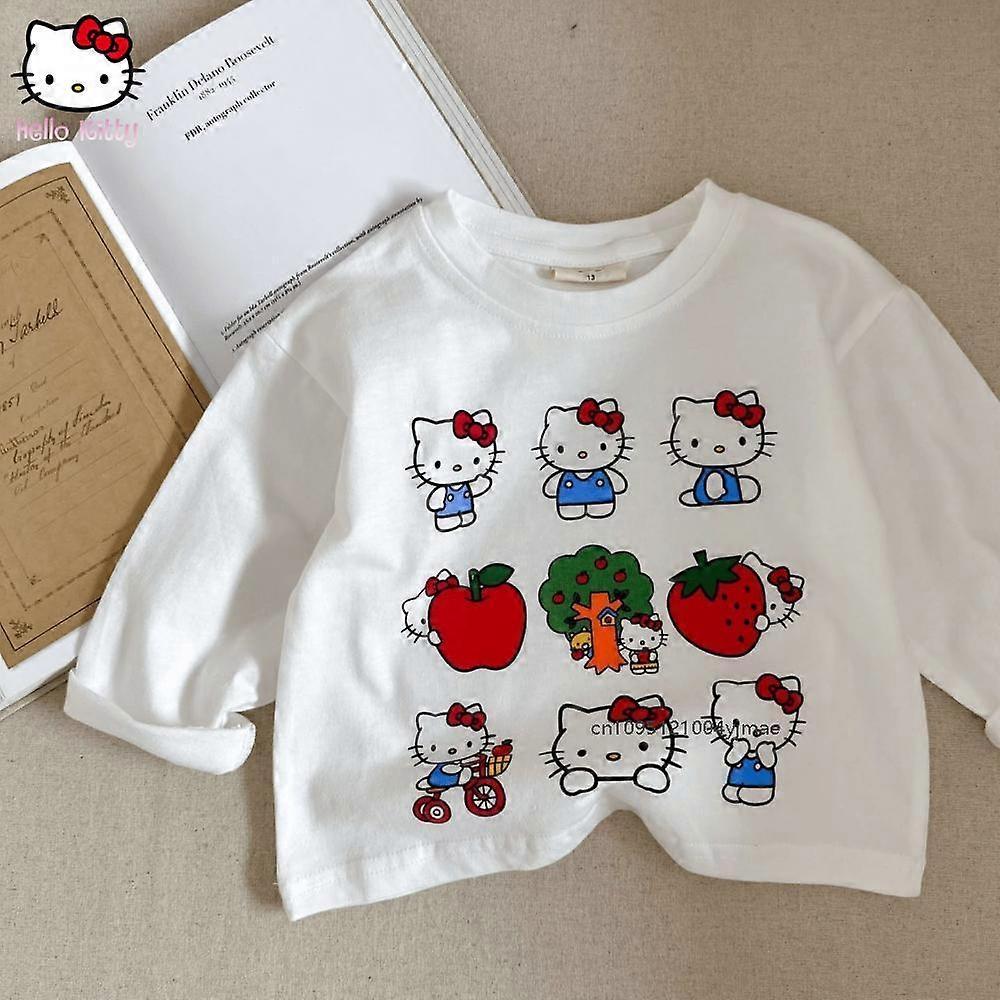 Sanrio New Girl Cotton White T-Shirt Long Sleeve Children Clothing Teen Cartoon Hello Kitty Print Pullover Casual Cute Kids Top