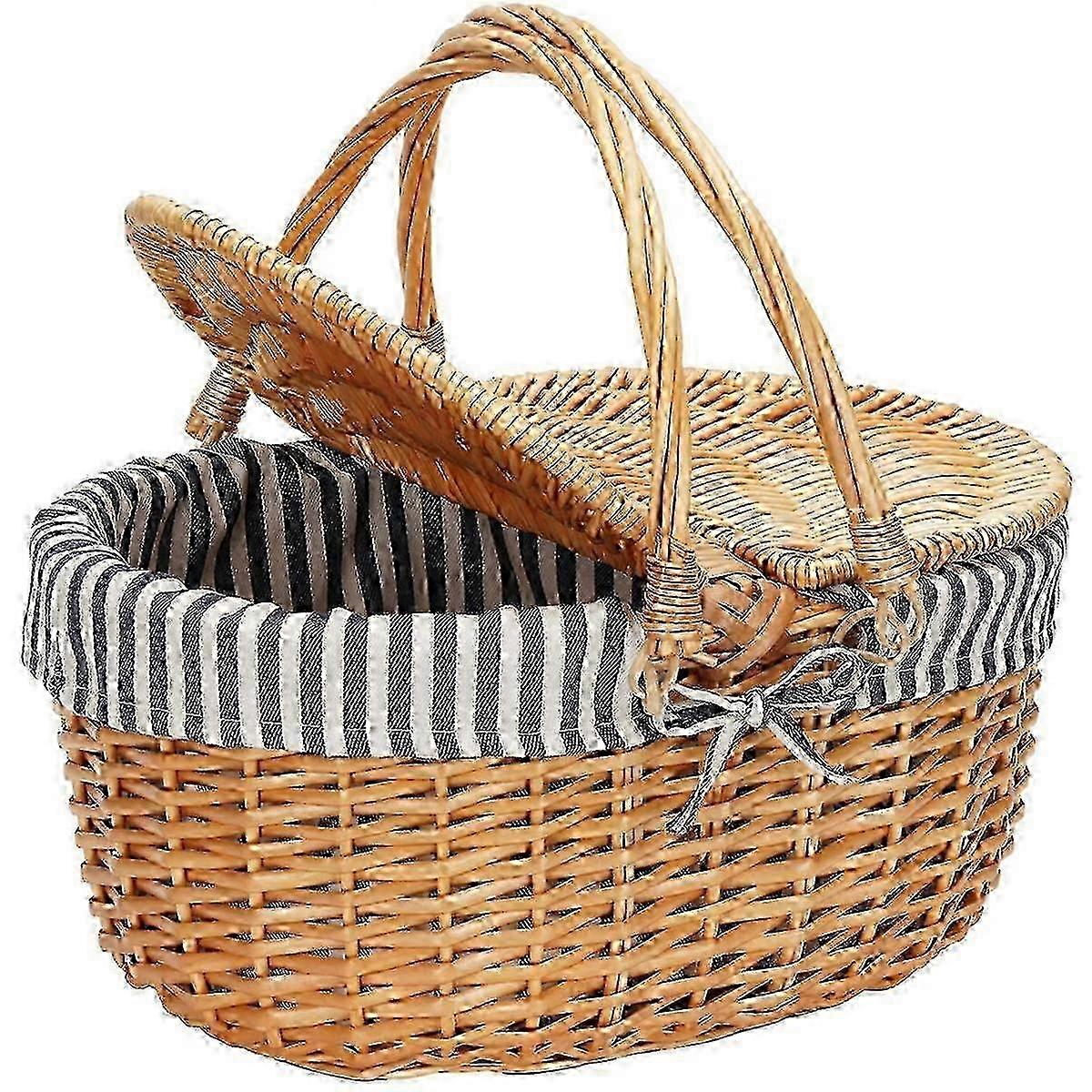 Wicker Picnic Basket with Lid,Wicker Basket with Handle and Liner, Handmade Shopping Basket,Braided 25-26s