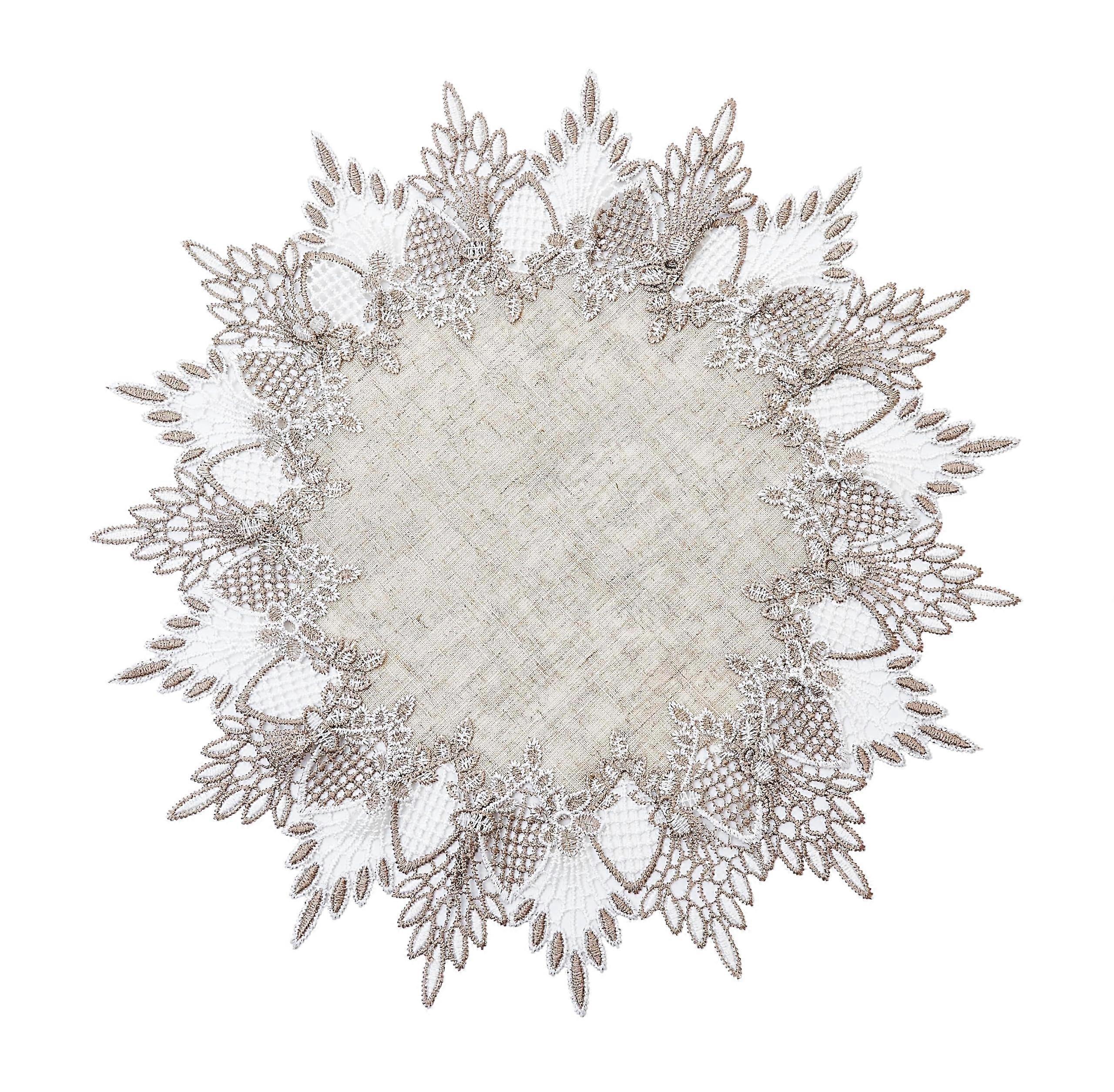 Linen Table Topper 15 Inch Round Beige Lace Doily for Coffee Table Elegant Embroidered Decor