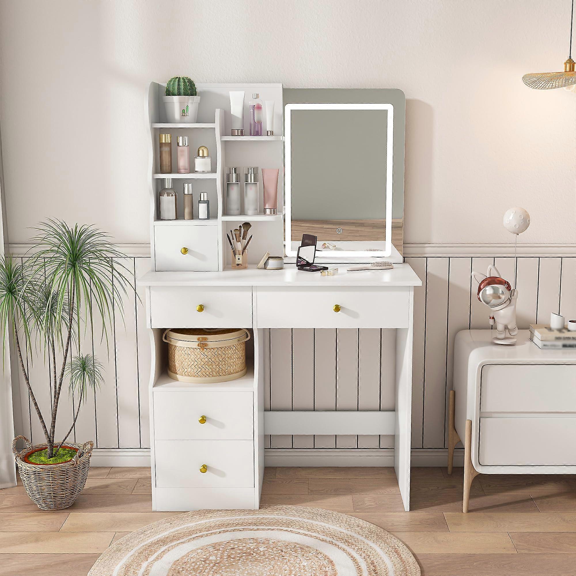 Makeup Vanity Desk with Drawers and LED Mirror Generous Storage Capacity: Designed to keep your beauty essentials organized, this vanity desk features spacious drawers ideal for storing cosmetics, skincare products, hair accessories, and other items. Builtin shelves with varying heights provide versatile open storage for home decor, framed photos, or everyday necessities you want within easy reach. The wellplanned layout helps maintain a clean and clutter environment, making daily routines more efficient. Definition Large LED Mirror: Equipped with a lighted mirror offering three adjustable color modes — warm, natural, and cool light — to suit different times of day and makeup requirements. Easily control brightness to your look, whether preparing for work, an evening event, or a casual outing. The HD clarity ensures precision during application, while the controlled lighting reduces shadows and highlights features accurately. Elegant Modern Design: Combining simplicity with style, this vanity complements bedrooms, bathrooms, closets, or hallways, serving as a functional yet attractive piece of furniture. Sturdy construction offers reliable daily use, while the clean white finish blends seamlessly with both modern and classic interiors. Ideal Gift Option: A practical and stylish choice for occasions such as Valentine's Day, Mother's Day, or Christmas. Its design and utility make it a thoughtful present for friends, family members, or anyone who values a dedicated beauty space. Easy to Assemble: Includes clear stepbystep instructions to ensure quick and straightforward assembly. No specialist tools are required, allowing you to enjoy your vanity table with minimal effort. Practical Applications: 1. Morning Routine: Use the drawers and shelves to keep daily makeup products on hand, ensuring fast and stress preparation before work or school. 2. Evening Glam: Adjust the mirror's lighting mode to match your outfit and ambiance when getting ready for special events or nights out. 3. Decorative Display: Store essential items while showcasing decorative pieces or sentimental photographs, enhancing both utility and aesthetics in your living space. Material and Performance: Crafted with durability in mind, the vanity's stable framework supports daily use while maintaining its appearance over time. The smart organization system minimizes clutter and promotes a pleasant, functional environment for beauty care and grooming.
