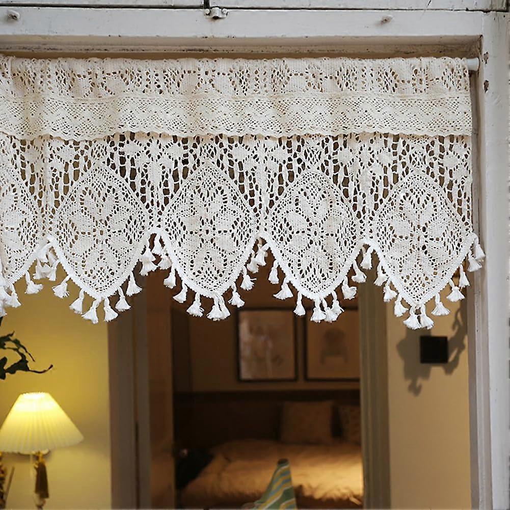Crochet Kitchen Valance Cotton Lace Curtain with Tassels Handmade Boho Rustic Rod Pocket 49'x16' Cream Ref:7530