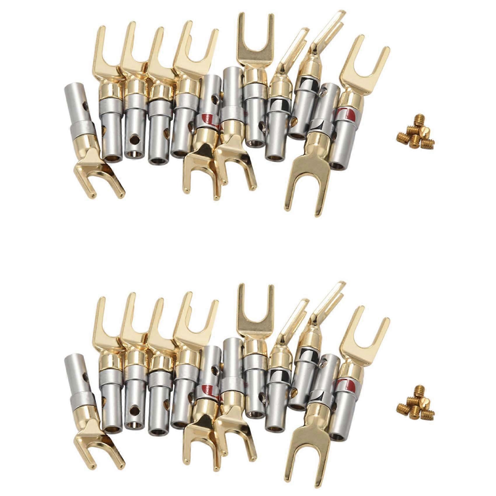 If you are looking for high quality secure connections, spade plugs are the way to go. They fit tighter on the wires than Banana and will not loosen over time, yet they are still easy to install. 45 Degree angled spade plugs are perfect for any speaker wire connections Gold plated to protect against corrosion and to ensure the highest quality audio with no distortion Safer than connecting bare wires. Keeps wires from crossing - Corrosion Resistant metal. colour: Gold + silver Material: Copper + gold plated Package Contents: 12 x Black plugs 12 x Red plugs