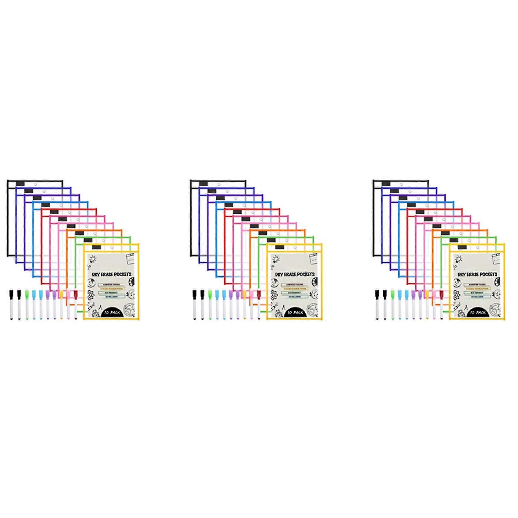 [HIGH QUALITY MATERAIL]The sheet protectors are made from high quality PET and have double sewn edges, could last for long time use. [PERFECT SIZE]These dry erase pockets have the size of 10x13 inch, perfect for protecting and reusing student worksheets and could easily hold most students' examination papers. [MULTICOLORS]This pack page protectors include 10 different colors dry file holders. They could be used many times without changing paper. Teachers like to use it in classroom. [ADVANTAGES]Using these dry erase pockets will save you much paper and money, for they are reusable, which help to protect our living environment. Writing and drawing on it is very convenient, for it's easy to erase, which could be good tool for kids to study and play. [ACCESSORIES]Every small dry erase board has a convenient marker pen holder and is equipped with an erasable pen for writing. There is also a grommet for easy hanging. Material:pet colour:Color mixing Package Contents: 30 * Dry Erase Pockets 30 * dry erase pens