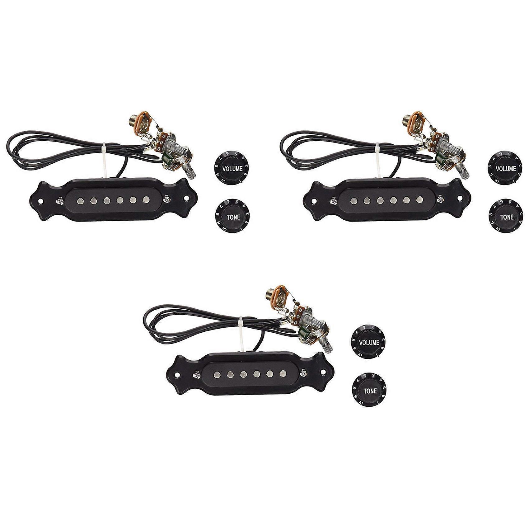 All-in-one pre-wired electric guitar pickup harness,Includes volume and tone pots and output jack This is an amazing little pre-wired 6-string magnetic pickup harness, ready to mount in your guitar, cigar box guitar or other stringed instrument without any need to solder or worry about wiring schematics. This harness features a 6-pole single coil pickup with a flanged black plastic base plate that makes it easy to surface mount on your build (you will still need to cut a hole in the surface to accommodate the bottom of the pickup). The pickup is wired to 500KOhm mini tone (with capacitor) and volume pots, and from there to the mono output jack. Black plastic Tone and Volume knobs are included along with mounting hardware for good measure. Colour: Black Material: metal alloy + ABS Packing size: 15*10*5cm Package Contents: 3 * pickup 3 * volume button 3 * Tuning button 3 pack * accessories